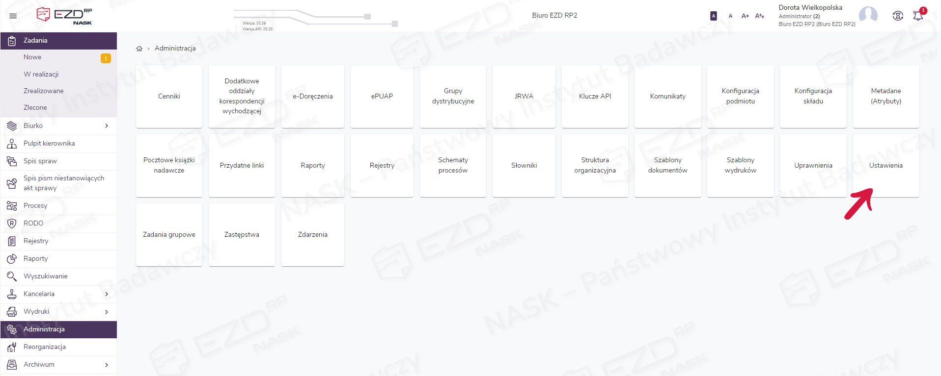 Aby skonfigurować odpowiednie ustawienia, użytkownik z uprawnieniami administratora w menu głównym powinien wybrać moduł Administracja, a następnie kliknąć kafelek Ustawienia.