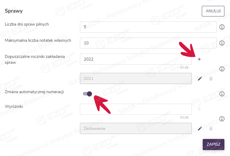 W polu Dopuszczalne roczniki zakładania spraw administrator wpisuje kolejno roczniki, w których będzie możliwość zakładania spraw. Wpisaną wartość należy zatwierdzić, klikając przycisk dodawania (ikona z symbolem plusa). Aby umożliwić pracownikom wpisanie dowolnego numeru zakładanej sprawy, należy włączyć za pomocą suwaka opcję Zmiana automatycznej numeracji.