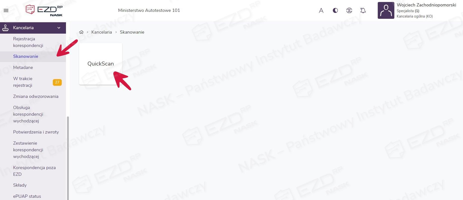 W celu zeskanowania dokumentów należy otworzyć aplikację. Jest to możliwe w widoku Kancelaria > Skanowanie, gdzie znajduje się kafelek QuickScan.