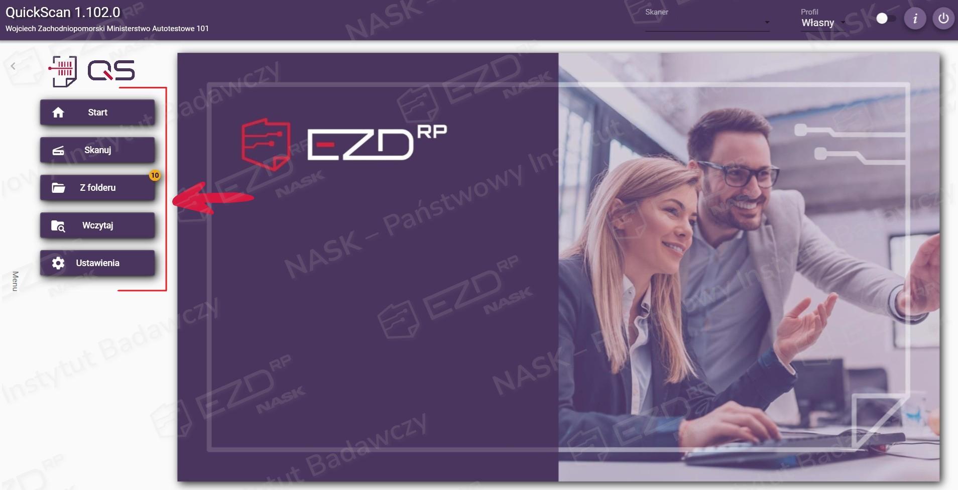 - Z folderu – pozwala na wczytanie dokumentów z konkretnego folderu. Folder należy wskazać w panelu Ustawienia aplikacji skanującej;