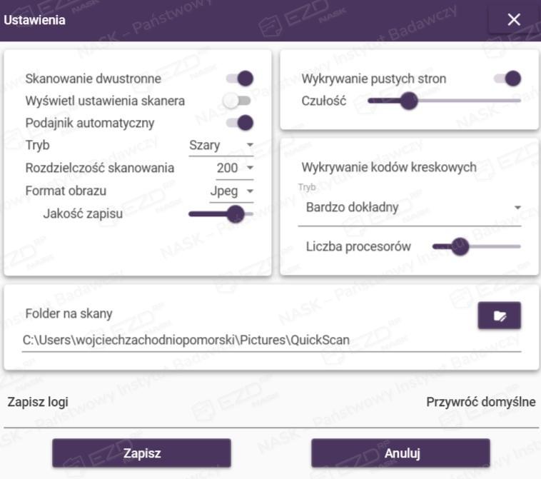 Użytkownik ma również możliwość zmiany ustawień aplikacji skanującej. Dostępne są następujące opcje: