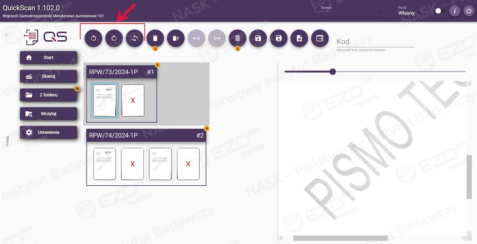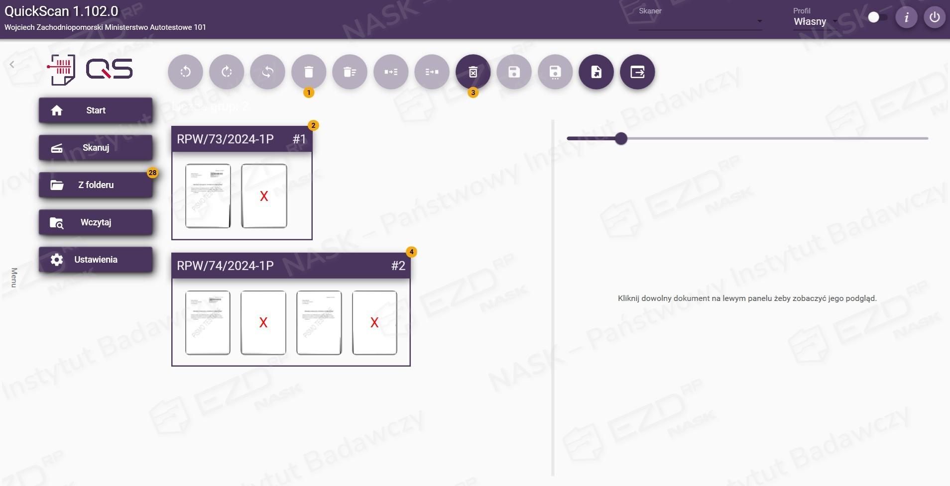 - Wczytaj – umożliwia wczytanie dokumentów z dysku (np. w przypadku skanowania do udziału sieciowego). Po wczytaniu dokumentów z kodami RPW możliwe jest ich wyeksportowanie do systemu EZD RP;