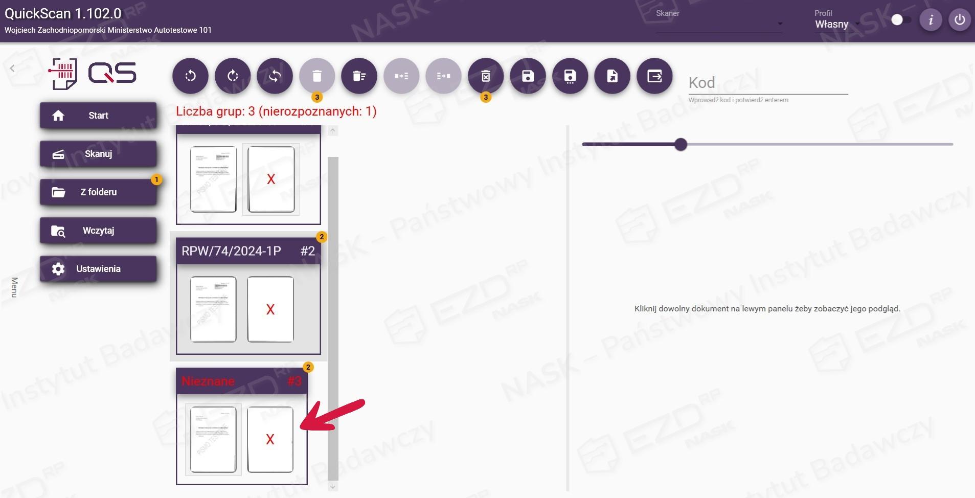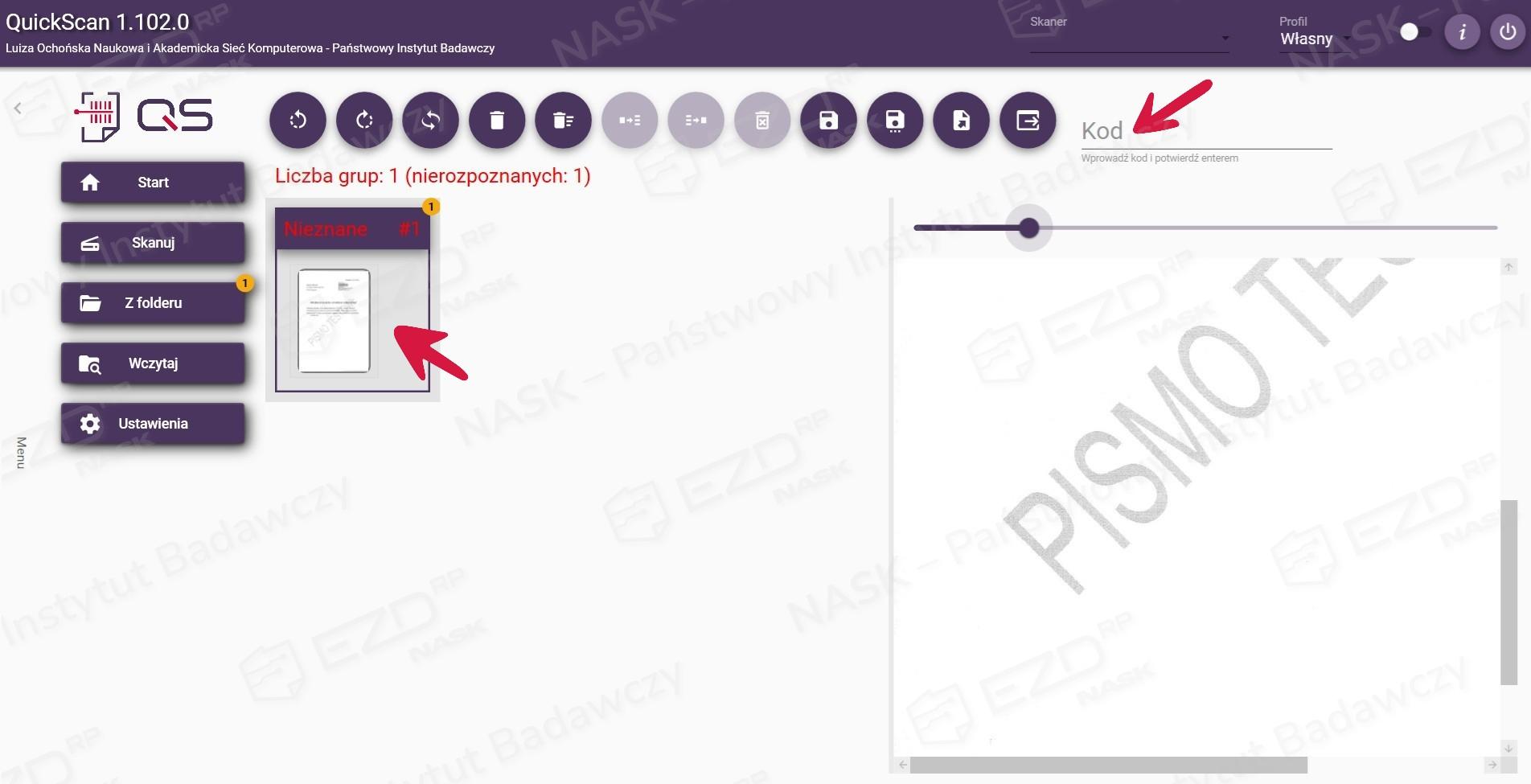 Jeśli podczas skanowania nie został wykryty kod kreskowy, QuickScan umożliwia wczytanie go za pomocą czytnika. W tym celu należy kliknąć odpowiednią grupę z dokumentami, a następnie w polu Kod, które pojawi się w prawym górnym rogu, wczytać kod kreskowy i zatwierdzić go Enterem.