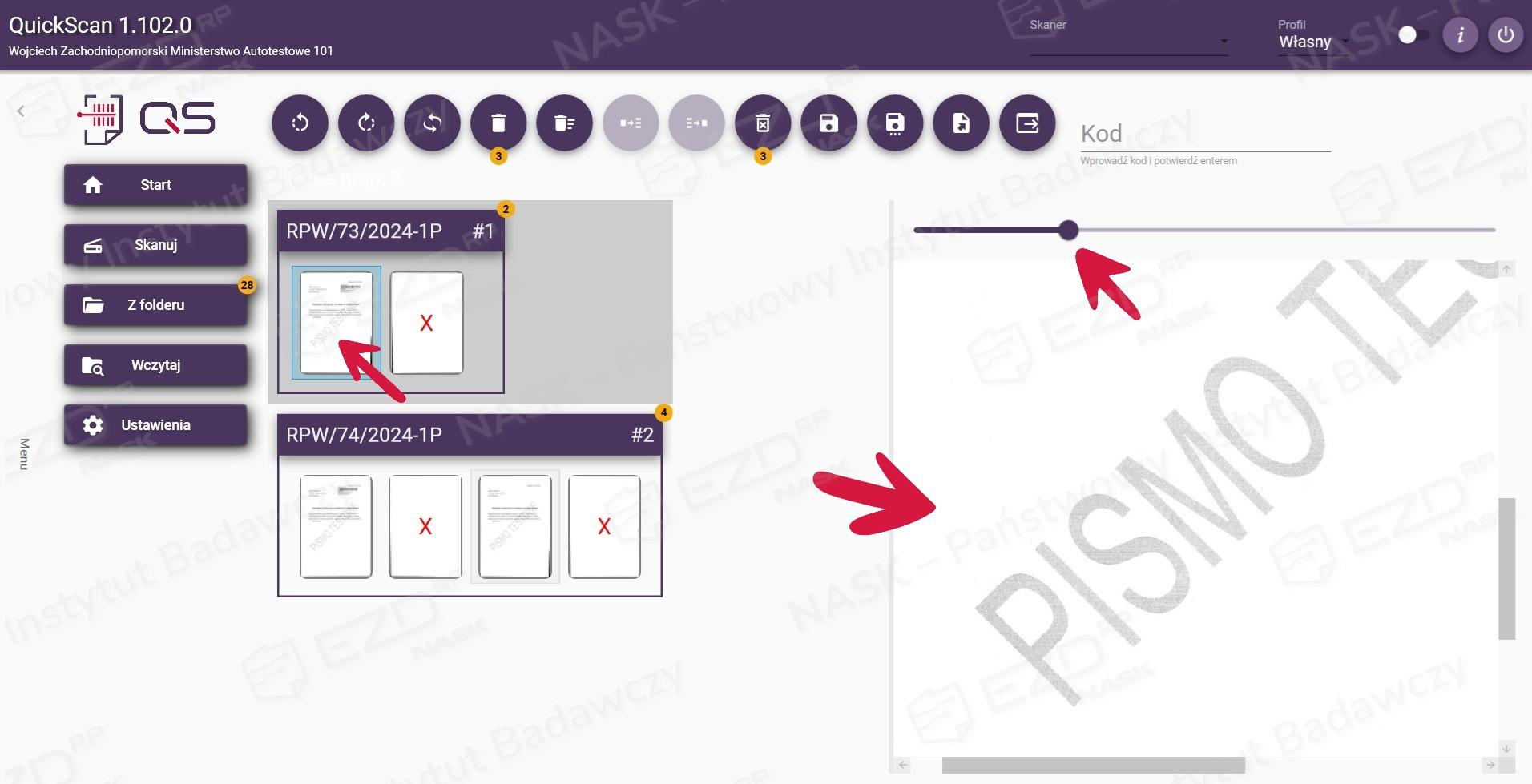 W celu sprawdzenia poprawności wykonanych skanów należy kliknąć interesujący nas dokument – wówczas w prawym panelu otworzy się jego podgląd. Aplikacja pozwala na powiększanie i pomniejszanie widoku – przesuwając suwak umieszczony nad podglądem strony można przybliżać i oddalać skan.