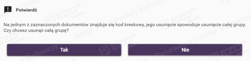 W przypadku próby usunięcia strony, na której znajduje się kod kreskowy z numerem RPW, system wyświetli komunikat z ostrzeżeniem.
