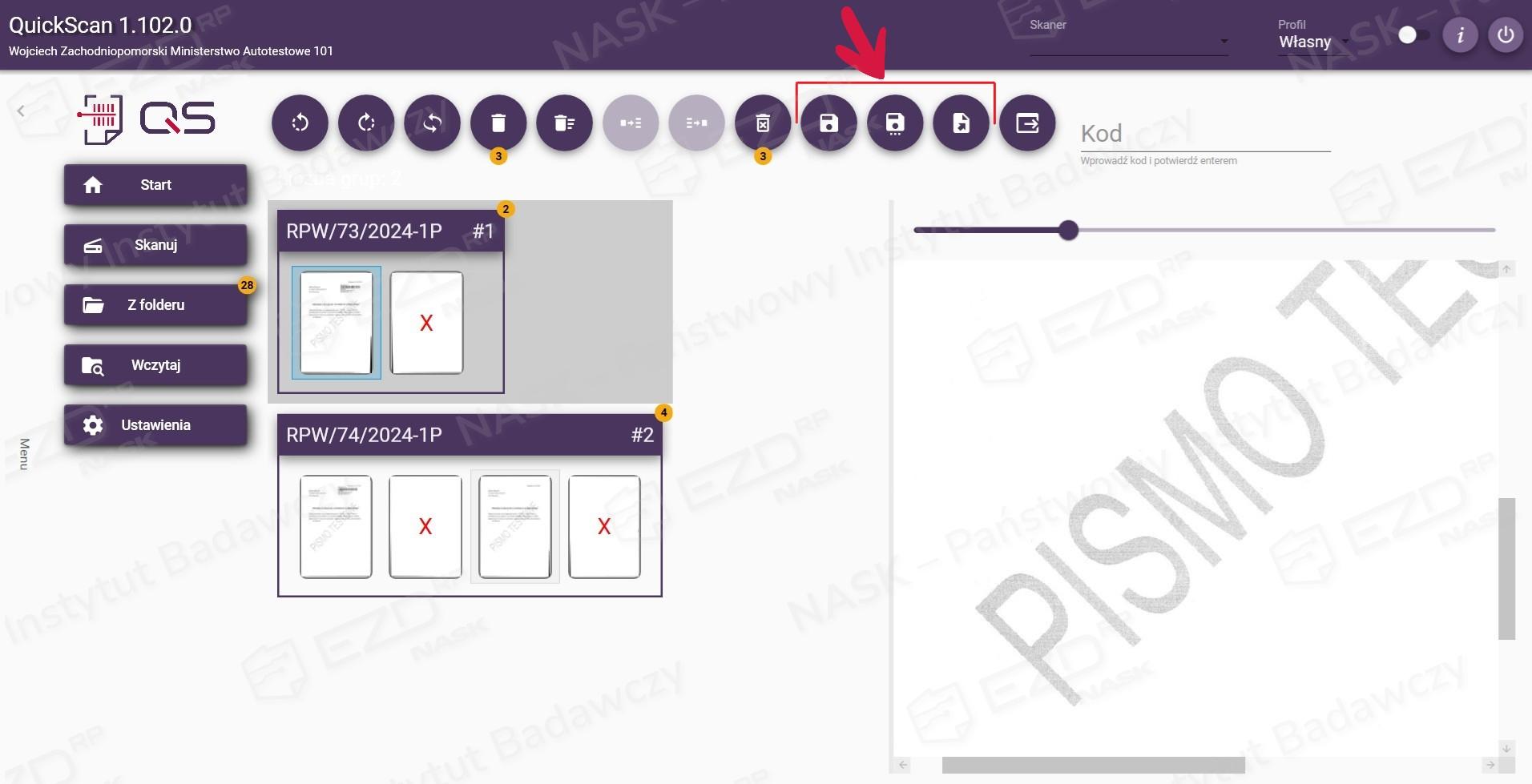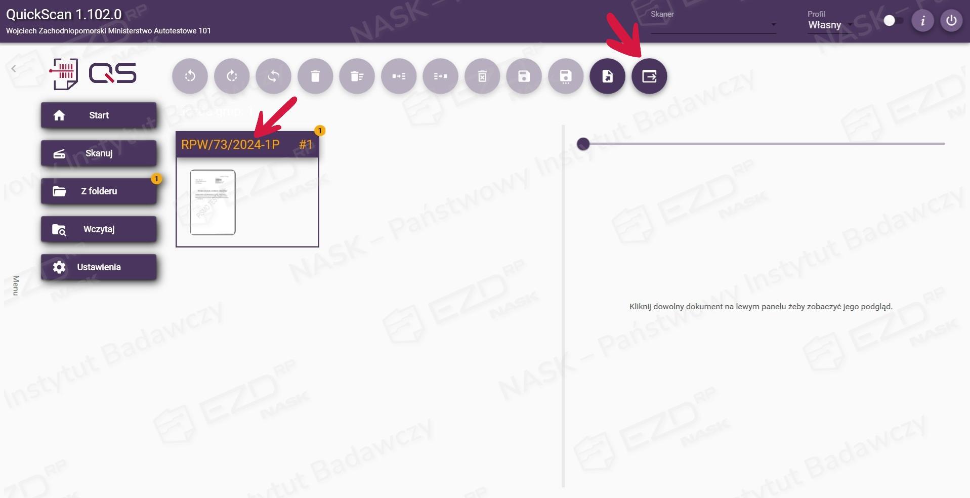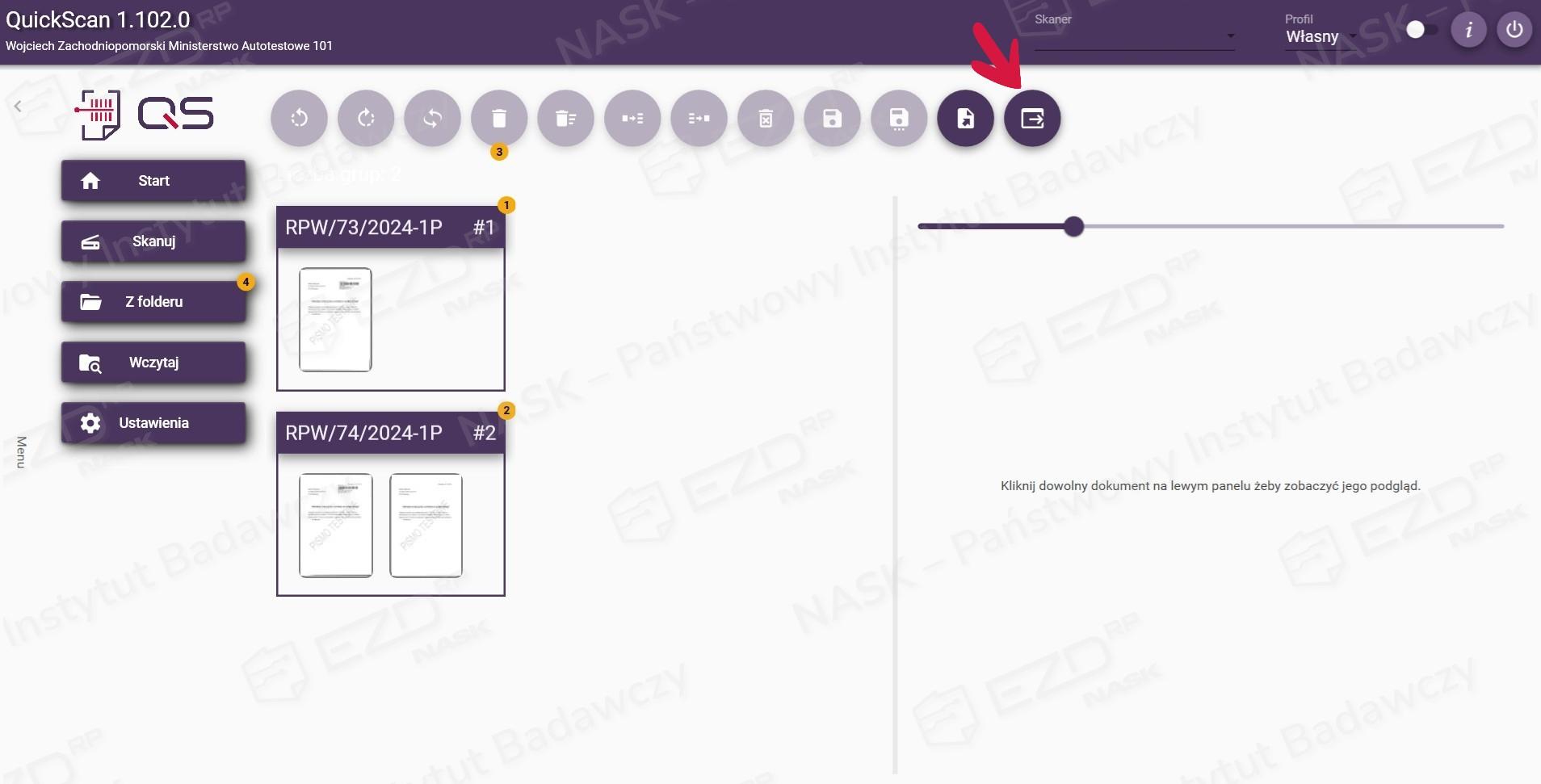 - Zapis danych do systemu EZD RP – eksportuje wszystkie zeskanowane grupy do systemu EZD RP i automatycznie podpina skany do odpowiednich dokumentów.
