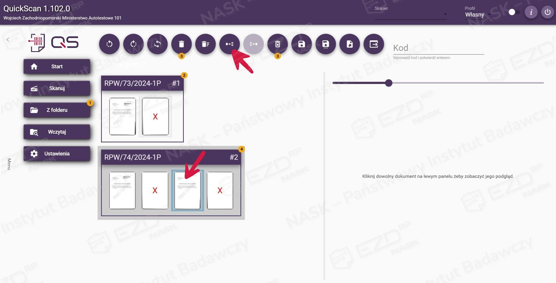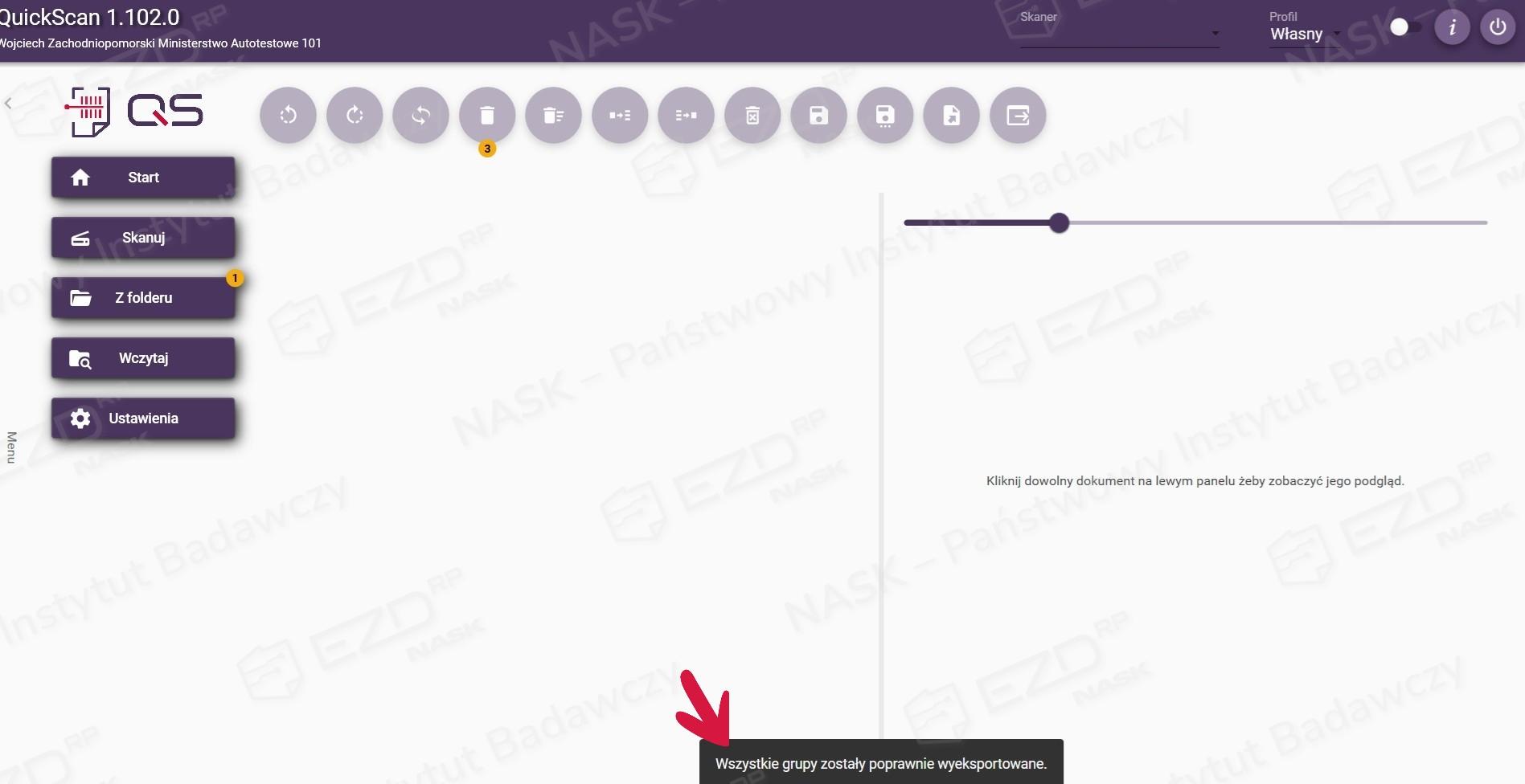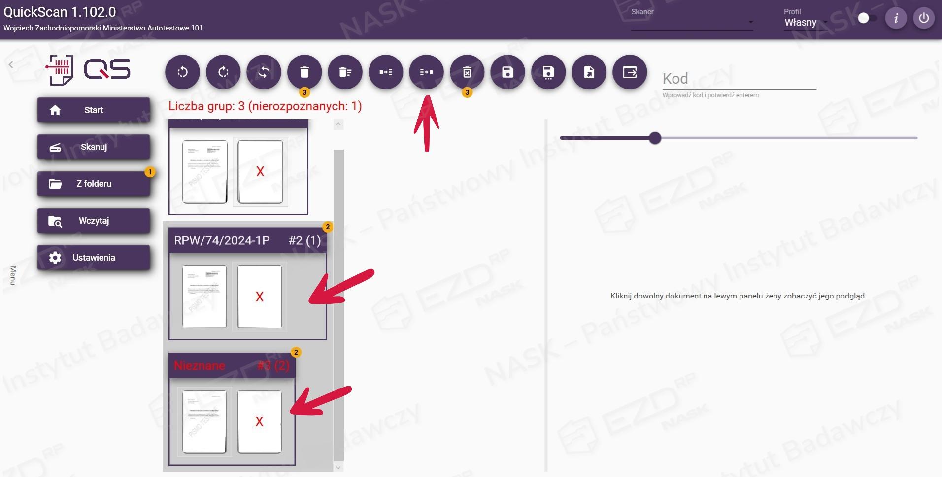 - Zapis danych do systemu EZD RP – eksportuje wszystkie zeskanowane grupy do systemu EZD RP i automatycznie podpina skany do odpowiednich dokumentów.
