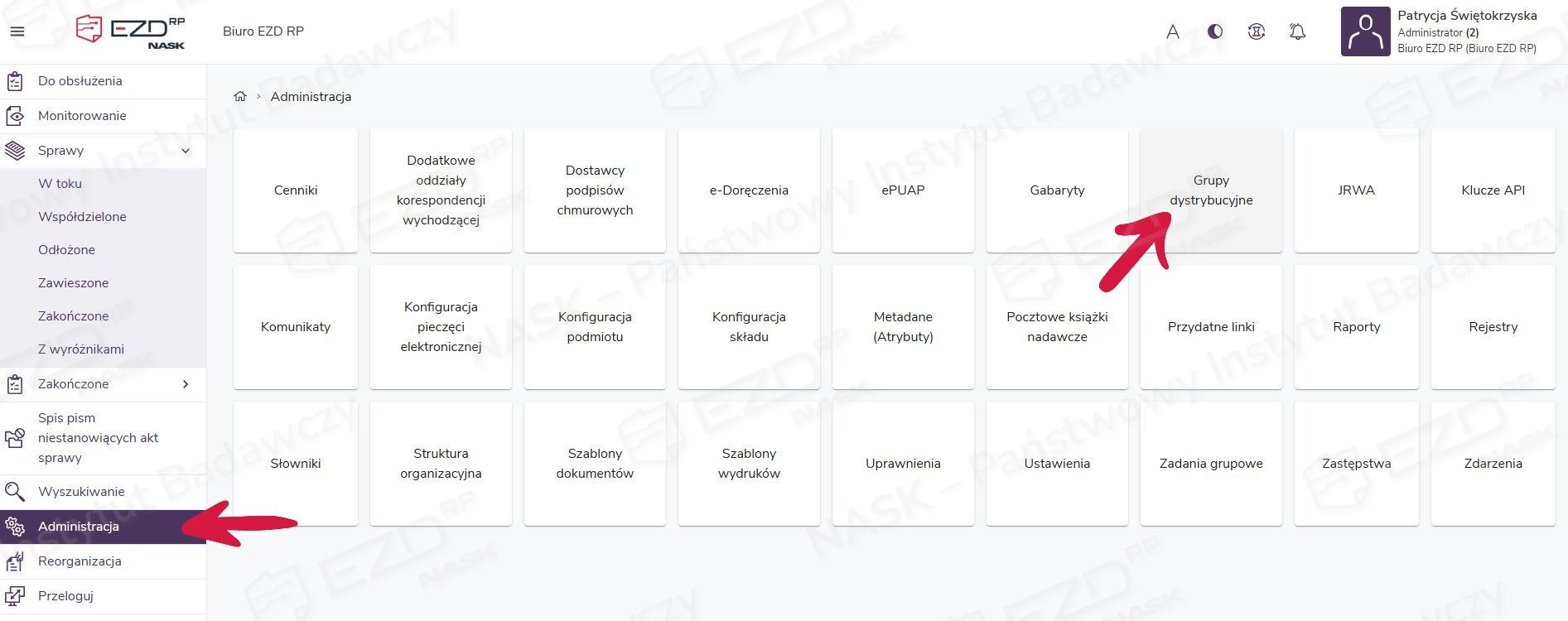 W pierwszym kroku należy wybrać w menu głównym moduł Administracja, a następnie kliknąć kafelek Grupy dystrybucyjne.