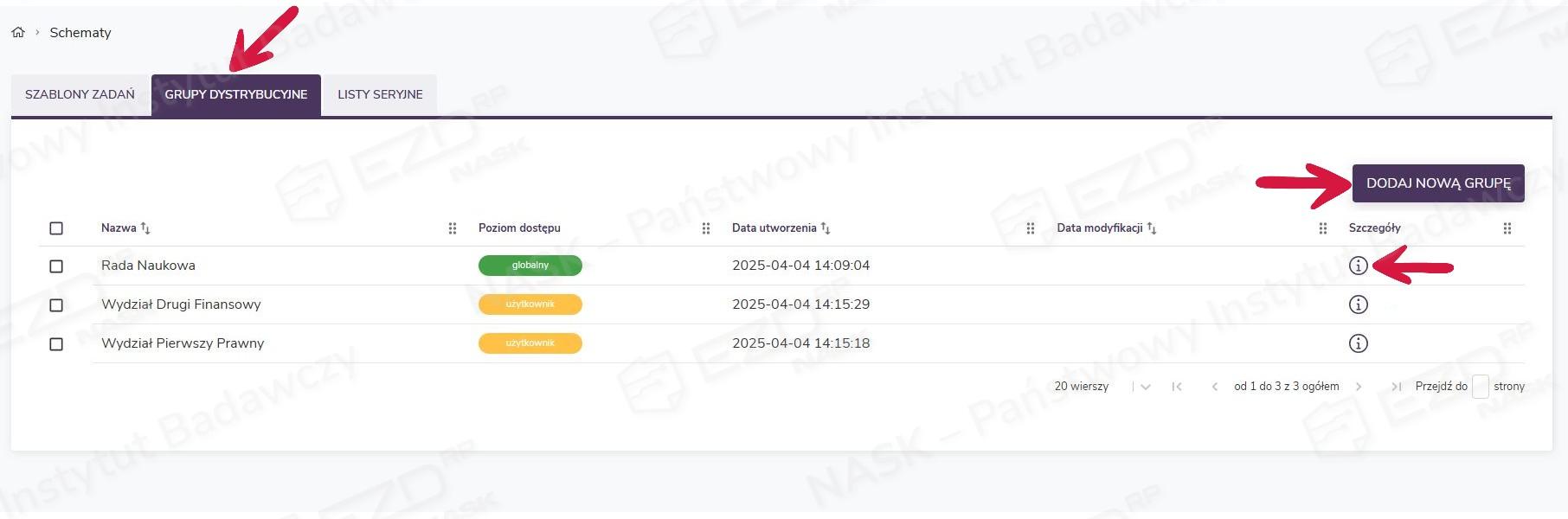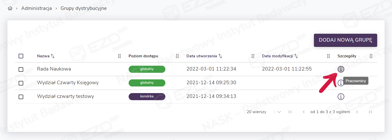 Po wejściu do modułu wyświetli się widok utworzonych grup dystrybucyjnych. Na końcu wiersza z nazwą grupy, w kolumnie Szczegóły, znajduje się ikona informacji.