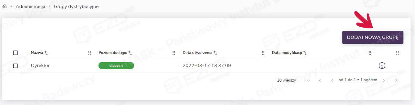 Aby dodać nową grupę dystrybucyjną, należy kliknąć przycisk Dodaj nową grupę.