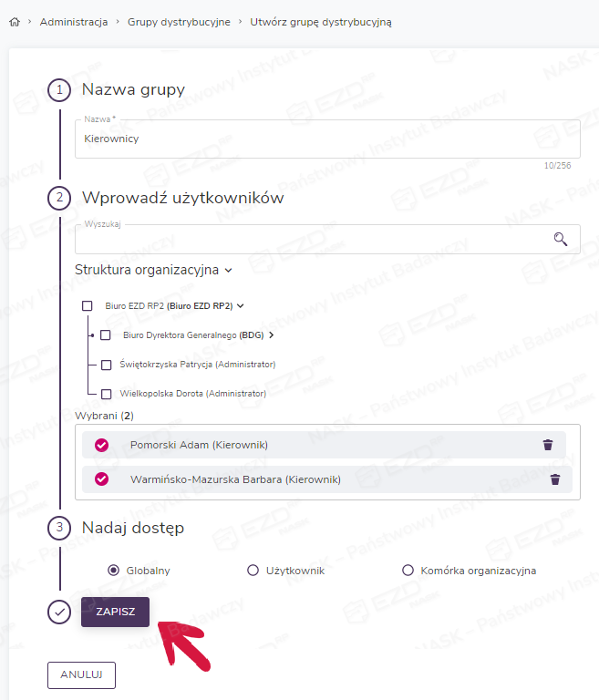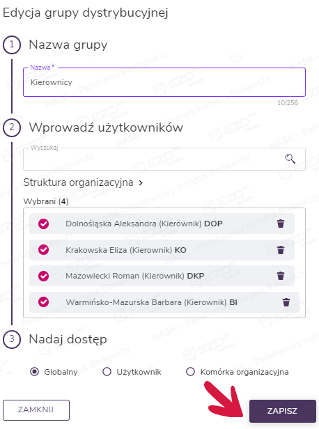 - Nadaj dostęp – możemy utworzyć grupę widoczną dla wszystkich pracowników danej instytucji (dostęp Globalny), grupę widoczną tylko dla konkretnego użytkownika (dostęp Użytkownik) lub grupę widoczną wyłącznie w danej komórce organizacyjnej (dostęp Komórka organizacyjna).