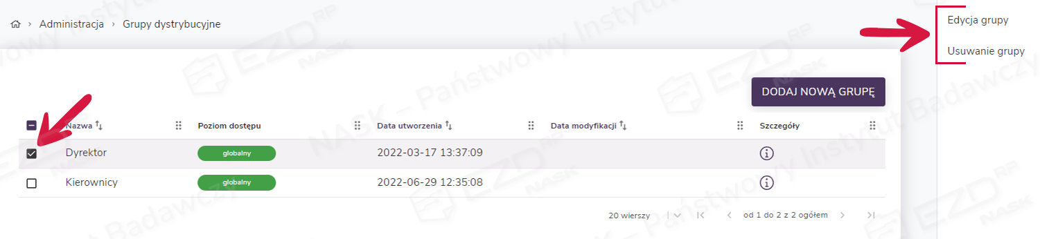 Po zaznaczeniu pola wyboru przy nazwie grupy dystrybucyjnej w menu kontekstowym po prawej stronie ekranu pojawią się opcje: Edycja grupy i Usuwanie grupy.
