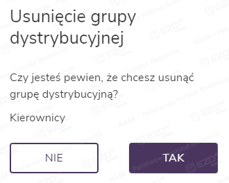 Z kolei opcja Usuwanie grupy pozwala na usunięcie grupy dystrybucyjnej z systemu. W tym celu w wyświetlonym panelu bocznym należy kliknąć przycisk Tak.