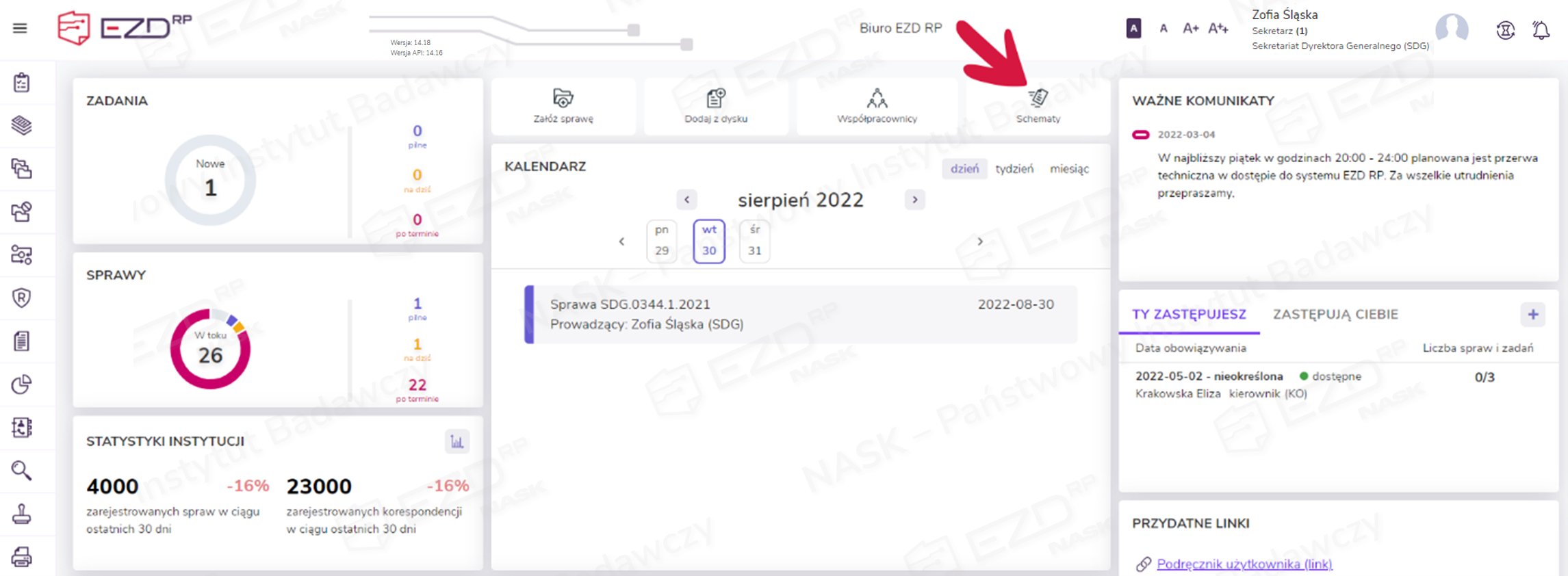 - litera A – oznacza, że podmiot korzysta z dotychczasowego sposobu gromadzenia i przetwarzania dokumentów (z modułami Zadania oraz Biurko > Pisma),