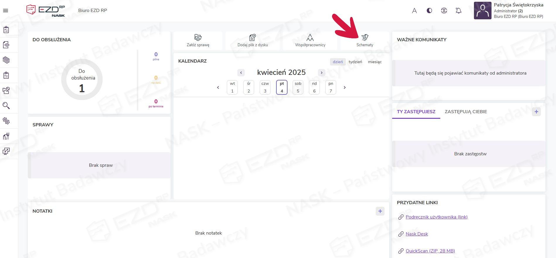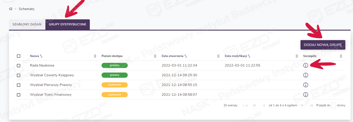 Podgląd i dodawanie grup dystrybucyjnych są również możliwe z poziomu strony startowej systemu – w tym celu klikamy przycisk Schematy i przechodzimy do zakładki Grupy dystrybucyjne. Kolejne kroki wyglądają analogicznie jak w module Administracja > Grupy dystrybucyjne.