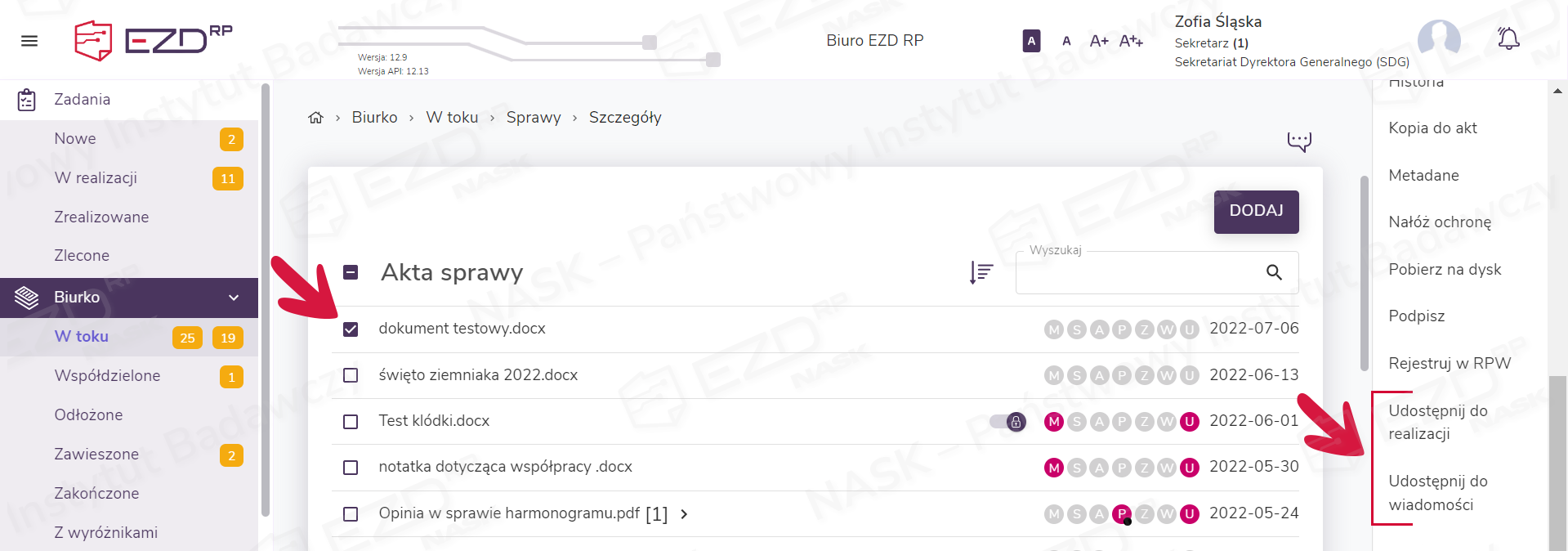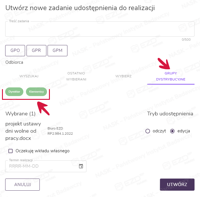 Poniżej znajduje się przykład użycia grup dystrybucyjnych o nazwach Dyrektor i Kierownicy dla funkcji Udostępnij do realizacji. W podobny sposób skorzystamy z grup dystrybucyjnych w przypadku funkcji Udostępnij do wiadomości.