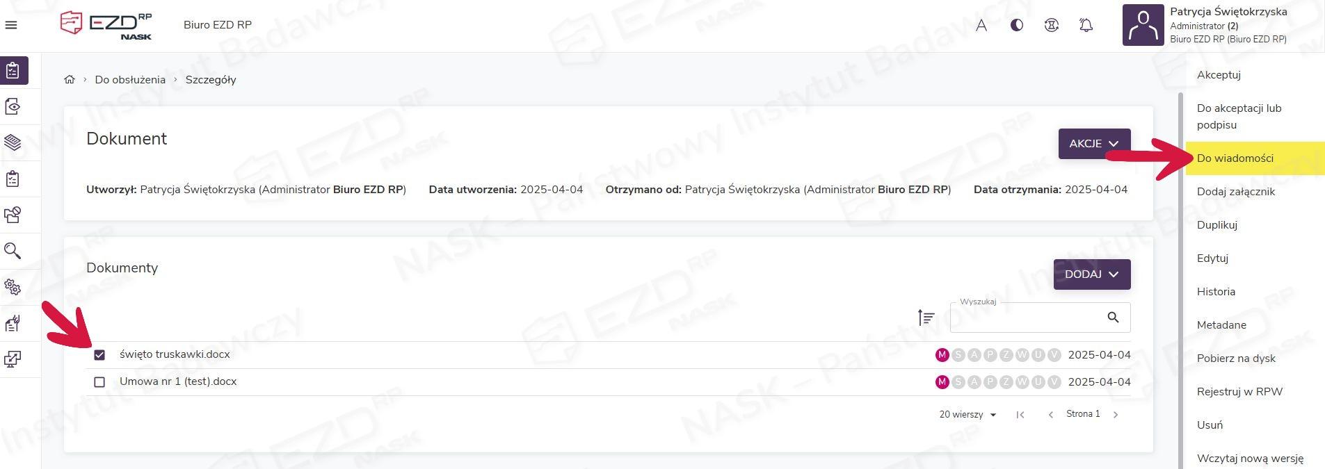W podobny sposób skorzystamy z grup dystrybucyjnych w przypadku funkcji Przekaż znajdującej się pod przyciskiem Akcje, z wykorzystaniem opcji udostępnij Do wiadomości.