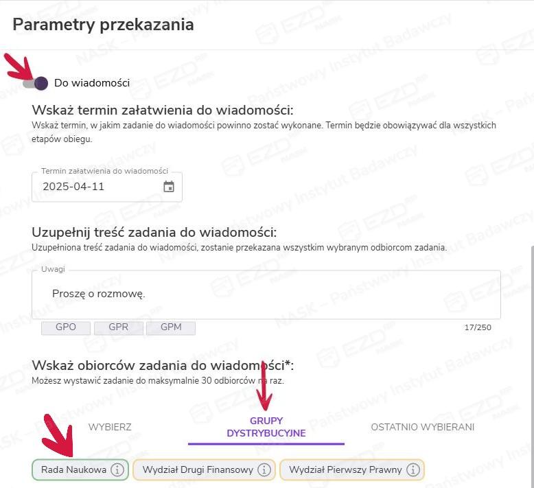 Poniżej znajduje się przykład użycia grup dystrybucyjnych o nazwach Rada Naukowa i Wydział Drugi Finansowy dla funkcji Do wiadomości.