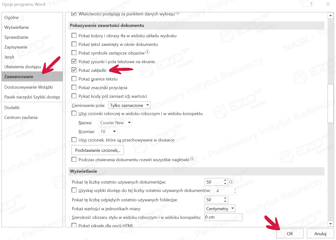 Widoczność zakładek zależy od ustawień w opcjach edytora Word. W celu wyświetlenia zakładek w szablonie dokumentu należy przejść do Plik > Opcje programu Word > Zaawansowane, a następnie do sekcji Pokazywanie zawartości dokumentu i zaznaczyć pole przy opcji Pokaż zakładki.