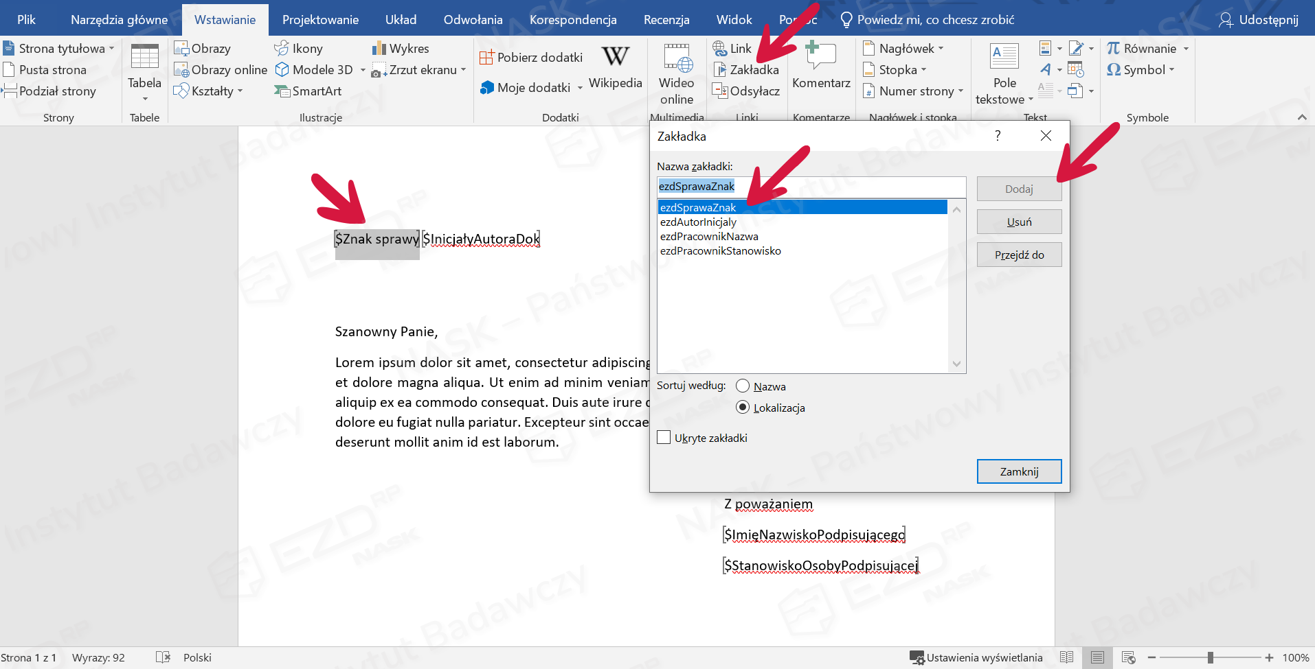 W celu dodania zakładki otwieramy szablon przygotowywanego dokumentu, zaznaczamy wybrane miejsce i wybieramy z górnego menu funkcję Wstawianie > Zakładka. Następnie wpisujemy nazwę zdefiniowanej w EZD RP zakładki (lista zakładek obsługiwanych w EZD RP znajduje się na końcu artykułu) i zatwierdzamy przyciskiem Dodaj.