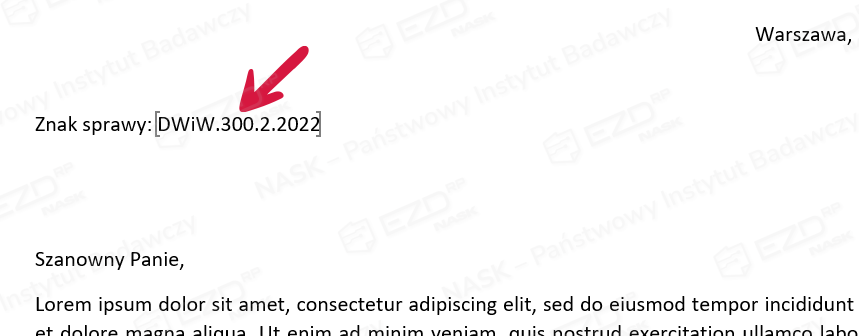 - wpisać nazwę zdefiniowanej w EZD RP zakładki ezdSprawaZnak