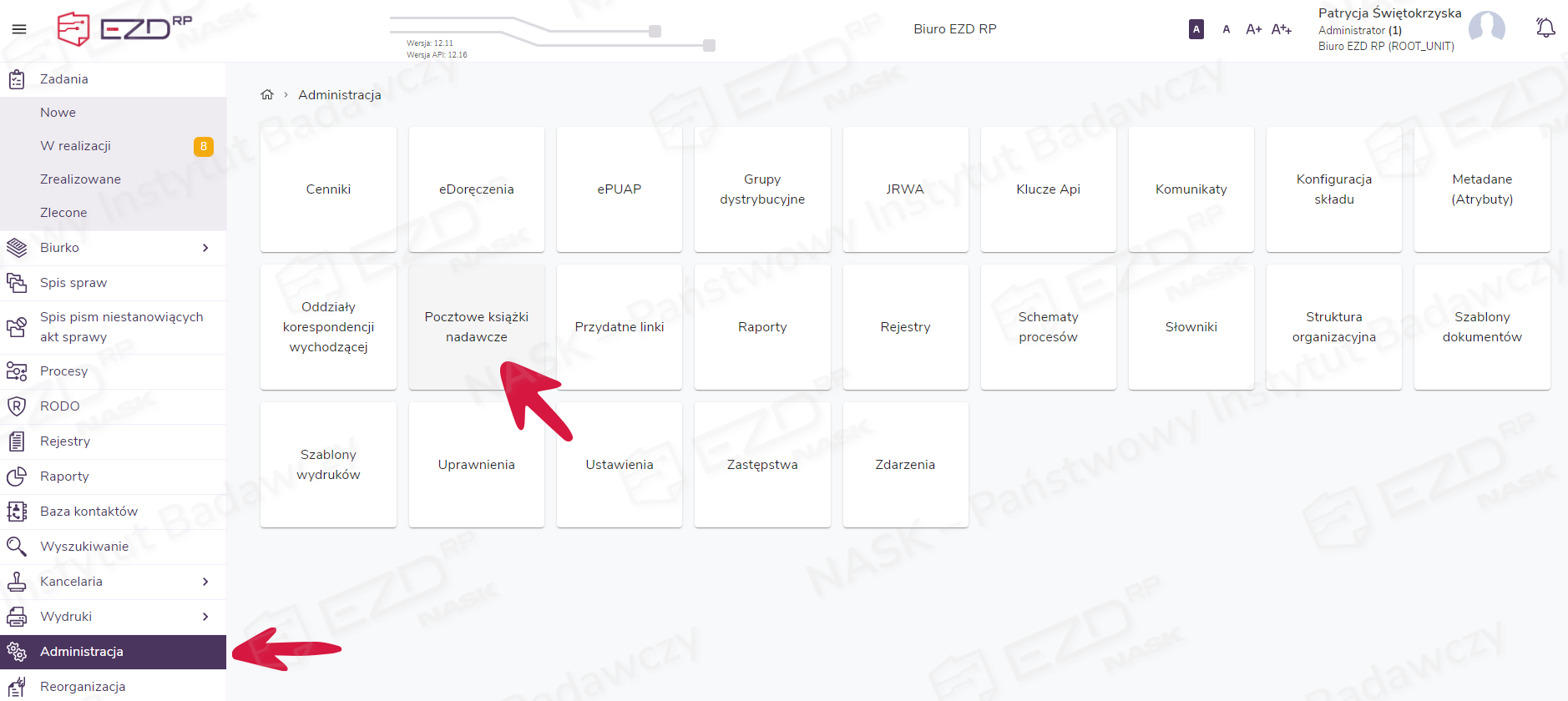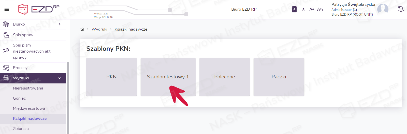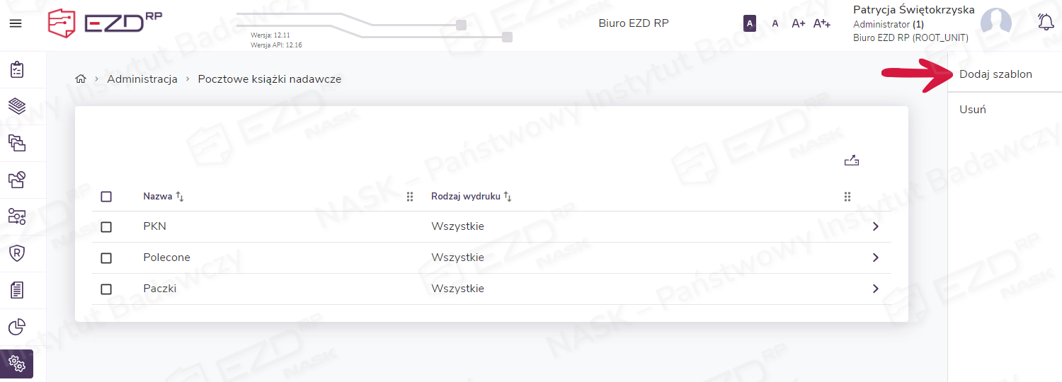 W celu utworzenia nowego szablonu PKN administrator lub uprawniony użytkownik przechodzi do modułu Administracja > Pocztowe książki nadawcze.