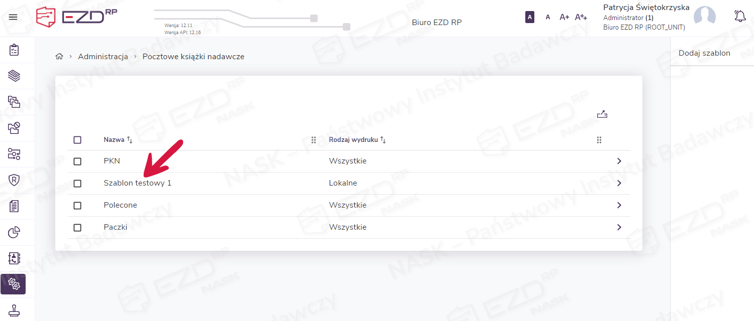 Aby zatwierdzić nowy szablon pocztowej książki nadawczej, klikamy przycisk Zapisz. Szablon pojawi się na liście w widoku Administracja > Pocztowe książki nadawcze.