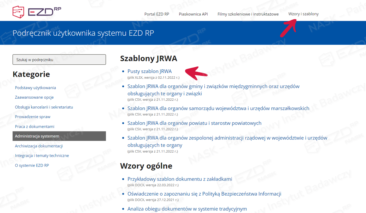 Ze strony Wzory i szablony można pobrać pliki z szablonami JRWA dla różnych typów podmiotów administracji publicznej. Po uzupełnieniu danych w poszczególnych kolumnach i zapisaniu arkusza w formacie CSV (obsługiwany przez większość programów bazodanowych i arkuszy kalkulacyjnych, w tym Microsoft Excel) pliki te mogą być użyte do zaimportowania danych do systemu EZD RP.