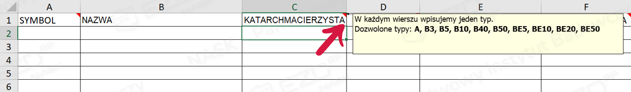 Należy też pamiętać, że w kolumnie KATARCHMACIERZYSTA mogą być wprowadzone następujące typy kategorii: A, B3, B5, B10, B40, B50, BE5, BE10, BE20, BE50. Natomiast niedopuszczalne jest użycie: