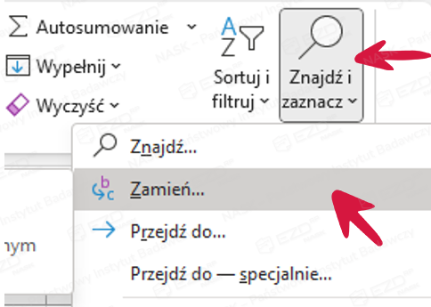 Należy wyszukać i odpowiednio zmienić wszystkie takie przypadki. W programie Excel można to zrobić przy użyciu opcji Znajdź i zaznacz.
