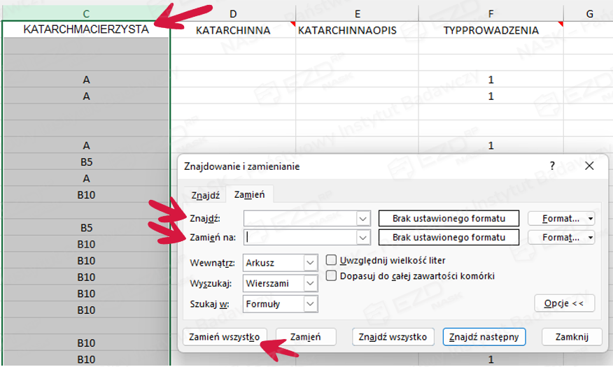 Jeśli chcemy np. usunąć wszystkie znaki spacji z kolumny KATARCHMACIERZYSTA, należy zaznaczyć tę kolumnę (wybranie wszystkich wartości) i wybrać opcję Znajdź i zaznacz > Zamień. W wyświetlonym oknie wprowadzamy spację w polu Znajdź:, a pole Zamień na: pozostawiamy puste (nie wprowadzamy żadnego znaku). Następnie klikamy opcję Zamień wszystko.