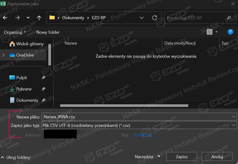 Przygotowany szablon zapisujemy jako plik w formacie CSV UTF-8 (rozdzielany przecinkami), wybierając odpowiednią opcję w oknie Zapisz jako typ: oraz wprowadzając nazwę pliku według wzoru: Nazwa_JRWA.csv.