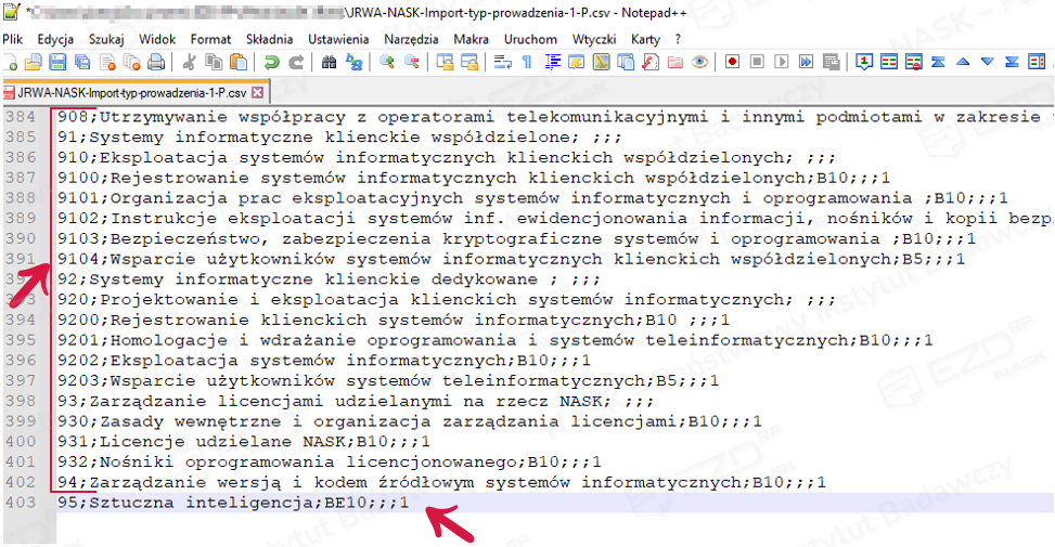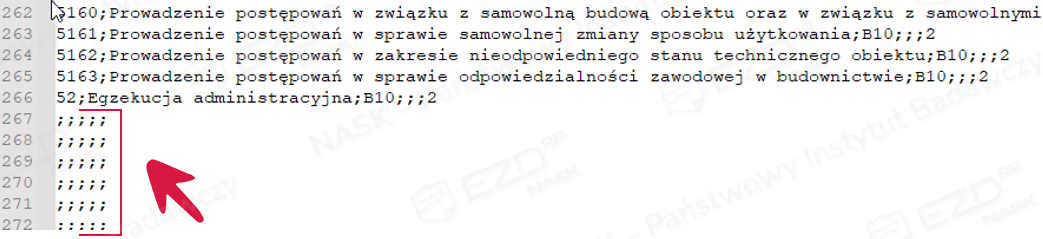 - jeżeli na końcu pliku występują tylko średniki, należy je usunąć – plik CSV powinien kończyć się ostatnią kategorią JRWA.
