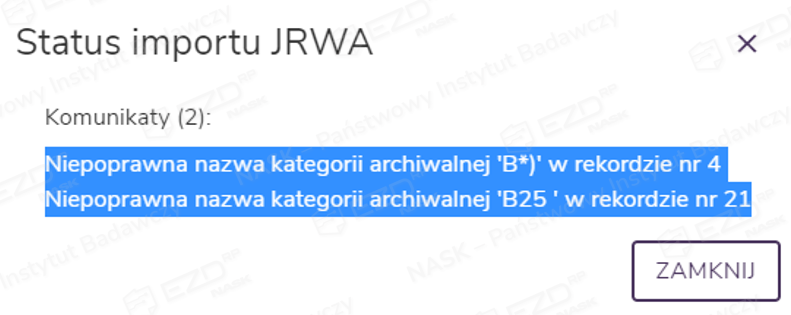 Przygotowany do importu do systemu EZD RP plik z JRWA powinien zawierać jedynie kategorie wskazane w wyżej wymienionym rozporządzeniu.