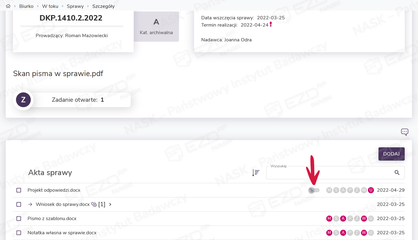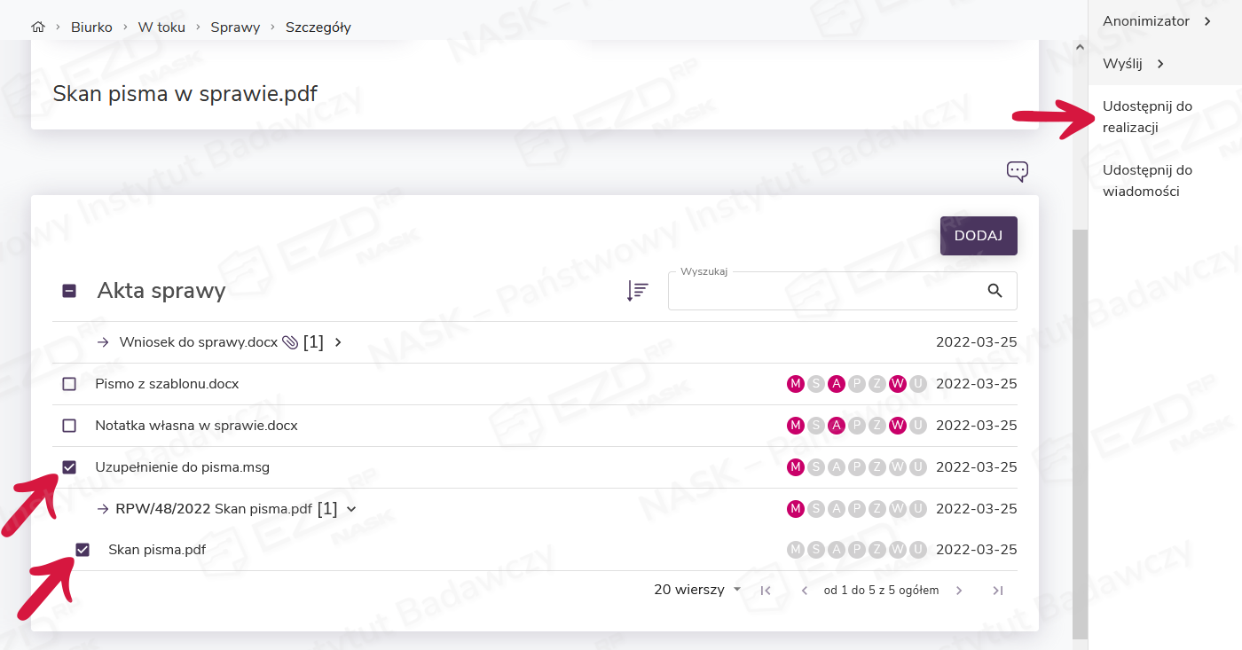 Aby udostępnić zadanie do realizacji, należy przejść do widoku akt sprawy. Zaznaczamy pola wyboru przy nazwach dokumentów, które mają zostać udostępnione, a następnie w menu kontekstowym po prawej stronie ekranu klikamy opcję Udostępnij do realizacji.