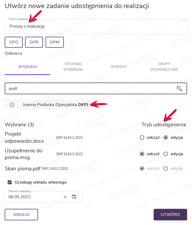 Wyświetli się panel boczny Utwórz nowe zadanie udostępnienia do realizacji. Należy w nim dodać treść zadania i wskazać osoby, którym zostaną udostępnione dokumenty. Następnie zaznaczamy, w jakim trybie chcemy je udostępnić (do odczytu lub edycji) i czy oczekujemy wkładu własnego. Można także wyznaczyć datę realizacji zadania. Po określeniu wszystkich parametrów należy kliknąć przycisk Utwórz.