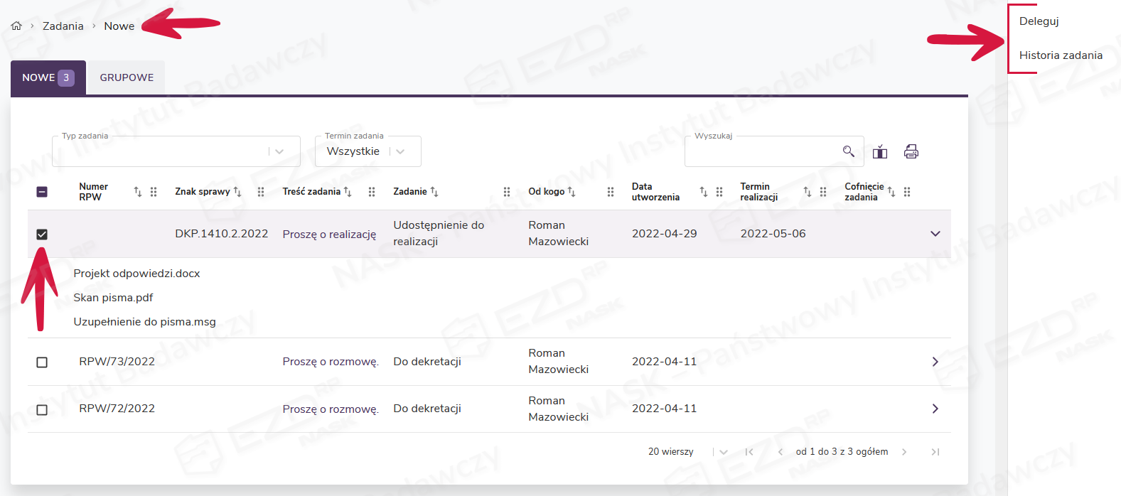 Pracownik, któremu pliki zostały udostępnione, zobaczy je na swoim koncie, w zakładce Zadania > Nowe. Po kliknięciu wiersza z zadaniem można przejść do jego szczegółów, a po zaznaczeniu pola wyboru wybrać jedną z dwóch opcji w menu kontekstowym: Deleguj lub Historia zadania.
