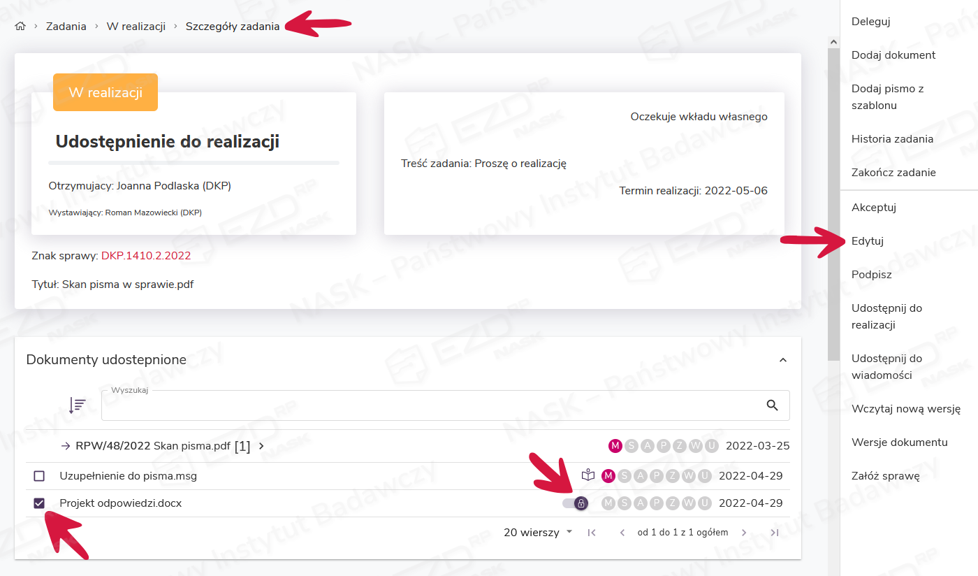 Przy dokumentach udostępnionych w trybie do edycji pojawi się ikona kłódki, która będzie widoczna przy dokumencie zarówno z poziomu akt sprawy, jak i z poziomu zadania. Aby móc edytować dokument, należy kliknąć ikonę otwartej kłódki, co spowoduje jej zamknięcie. Dzięki tej czynności w menu kontekstowym pojawi się dodatkowa opcja – Edytuj.