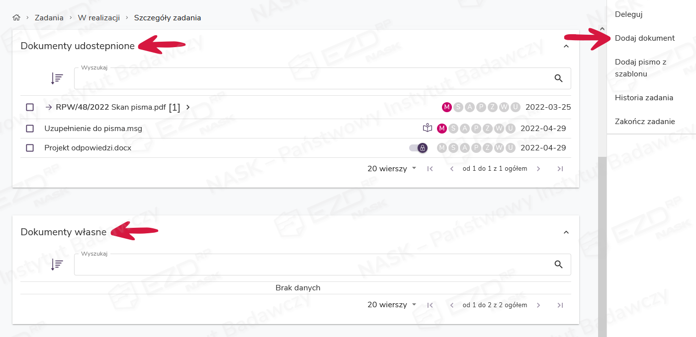W sekcji Dokumenty własne pojawią się dokumenty utworzone przez użytkownika, który pracuje na zadaniu. Tworzenie własnych dokumentów umożliwia opcja Dodaj dokument.