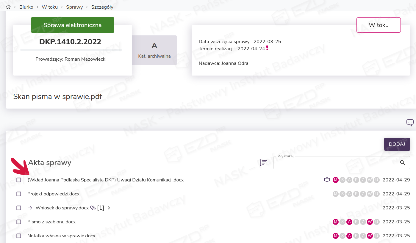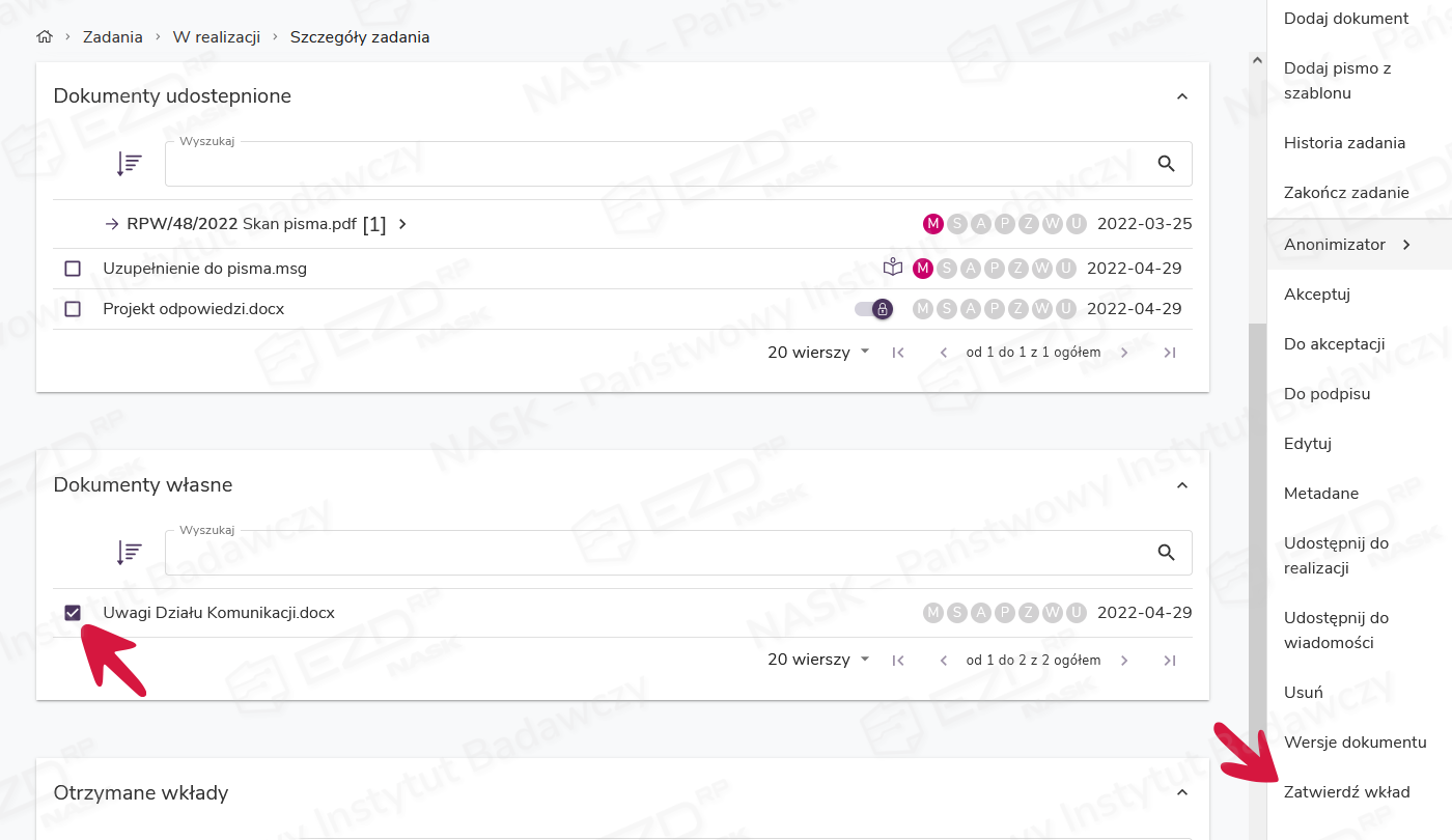 Wszystkie te czynności wykonuje się tak samo jak w przypadku dokumentów dostępnych w sprawie czy na biurku. Aby przygotowane dokumenty pojawiły się w aktach u osoby, która zleciła zadanie, należy takie dokumenty zatwierdzić, klikając Zatwierdź wkład.