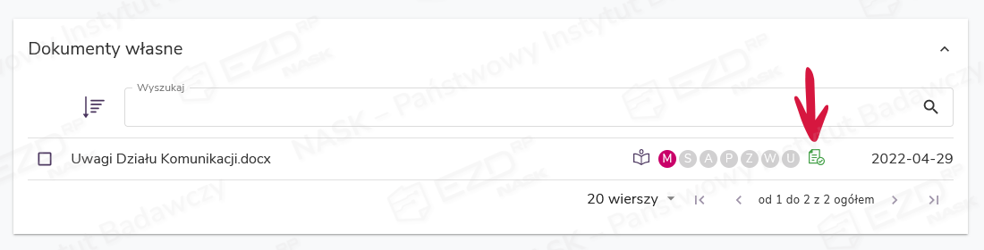 Przy zatwierdzonych dokumentach, czyli tzw. wkładach własnych, pojawi się zielona ikona oznaczająca zatwierdzony plik.
