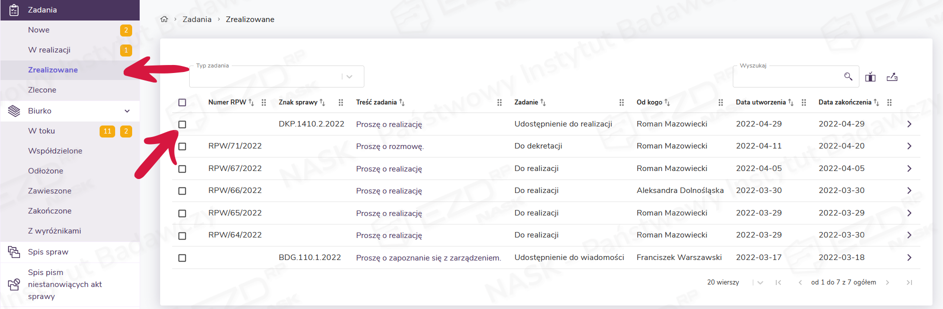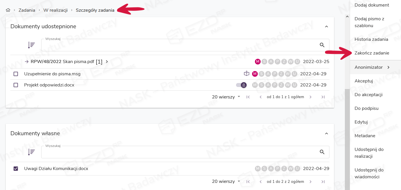 Jeśli praca na zadaniu udostępnienia zostanie zakończona, należy je zamknąć, wybierając w menu kontekstowym z prawej strony ekranu opcję Zakończ zadanie. Po jej kliknięciu zadanie pojawi się w widoku Zadania > Zrealizowane.