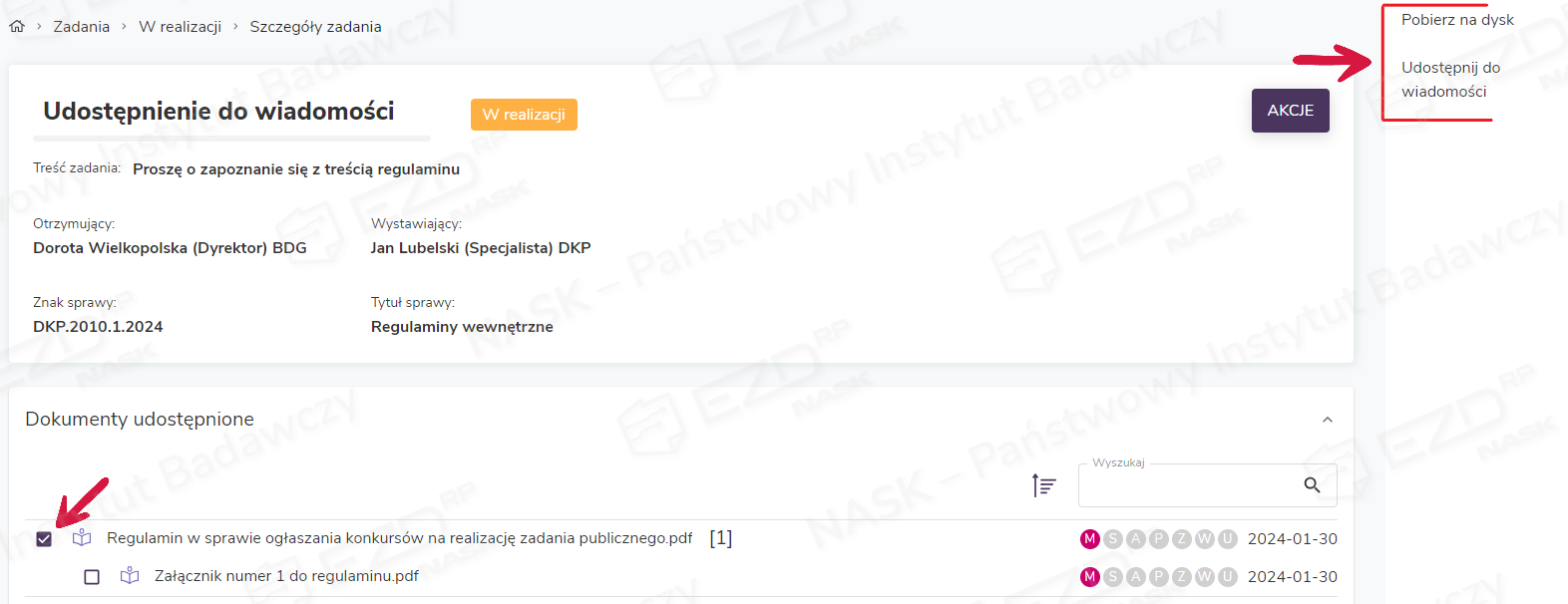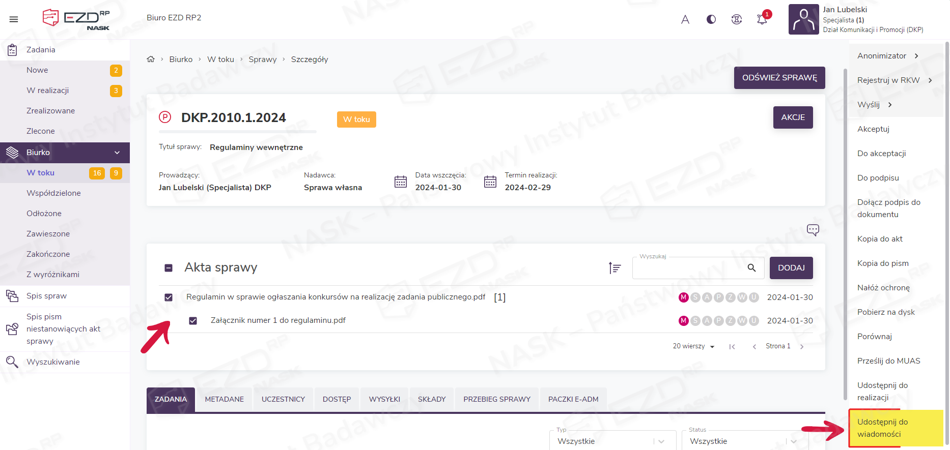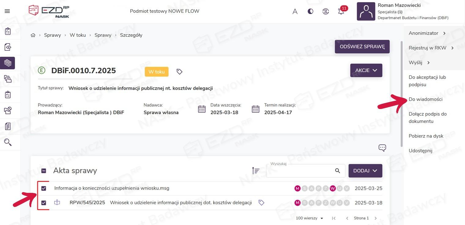 Chcąc utworzyć zadanie Do wiadomości ze sprawy, należy przejść do widoku Akt sprawy i zaznaczyć pole/pola wyboru przy dokumencie/dokumentach, które mają zostać udostępnione innym użytkownikom do odczytu. Następnie z menu kontekstowego po prawej stronie ekranu trzeba wybrać funkcję Do wiadomości.