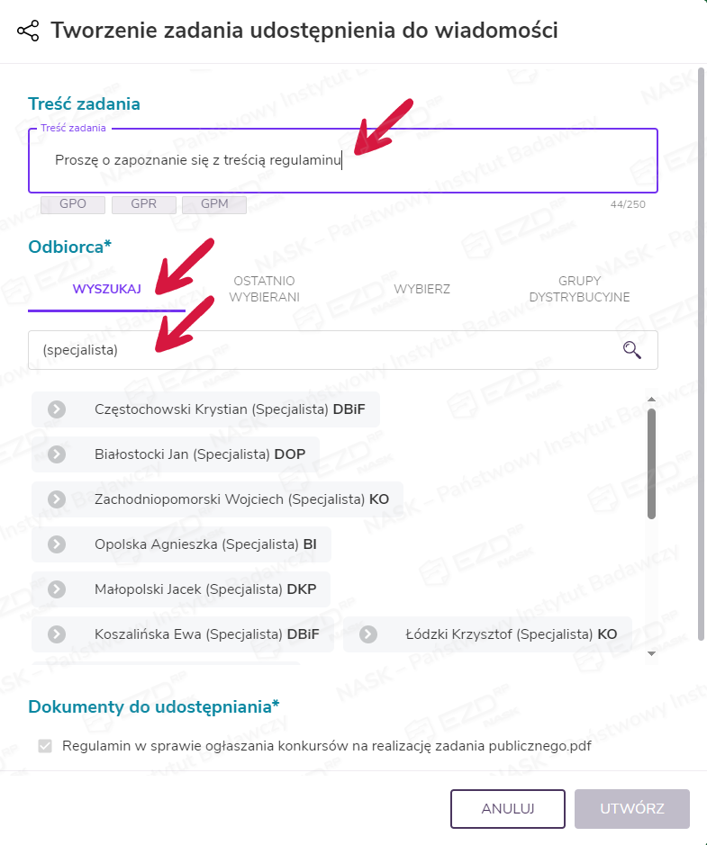 Jeśli użytkownik wybierze opcję Udostępnij do wiadomości, system wyświetli mu ten sam widok co pracownikowi tworzącemu zadanie z poziomu Akt sprawy. W ten sposób użytkownicy otrzymujący dokumentację w celu zapoznania się z nią mogą ją dalej udostępniać do wiadomości kolejnym osobom.