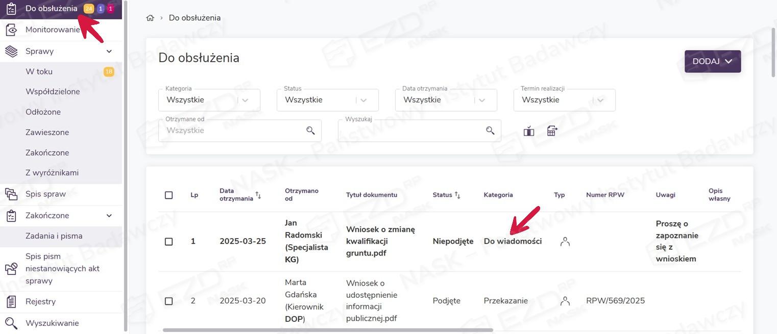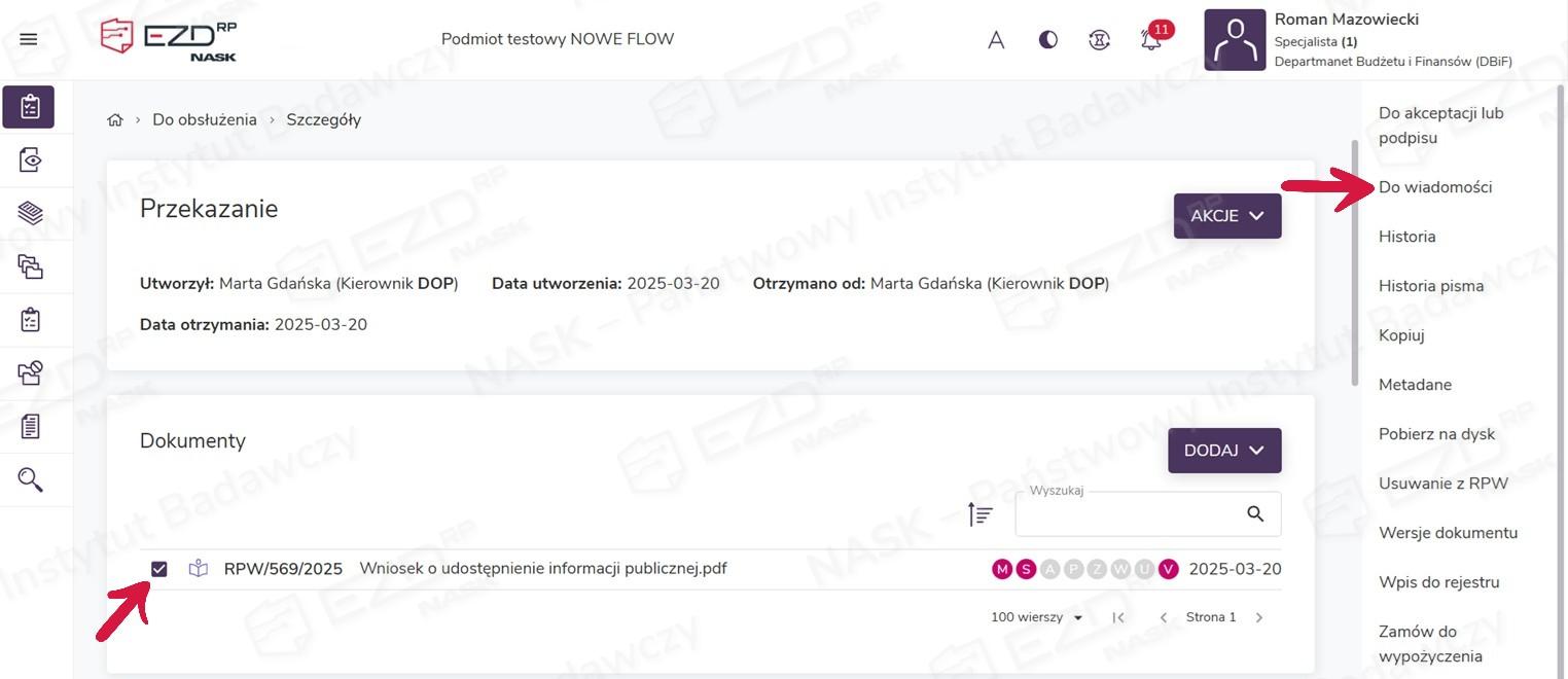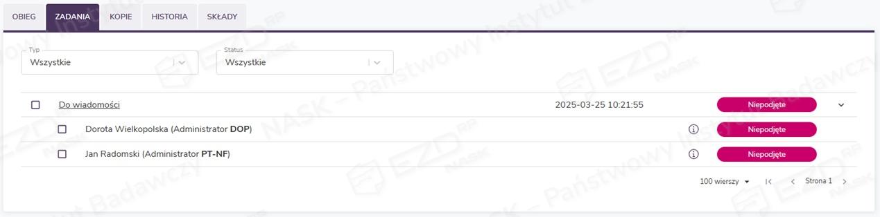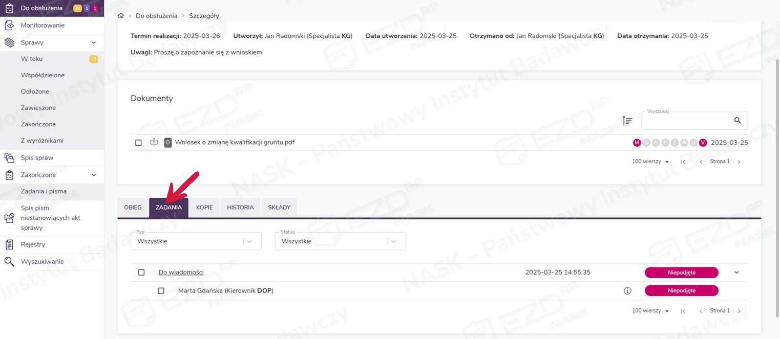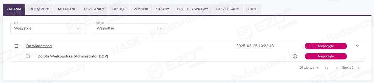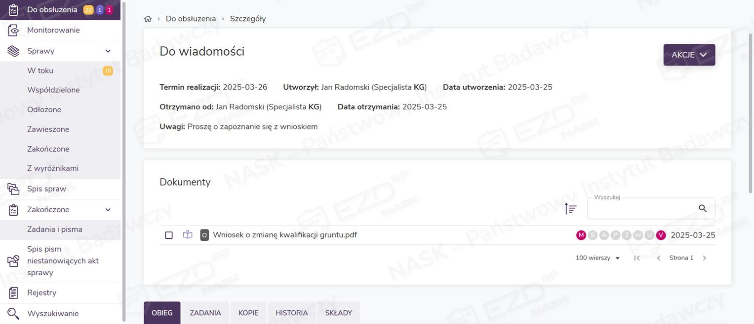 Wystawione zadania pojawią się na kontach użytkowników wskazanych podczas ich tworzenia w sekcji Do obsłużenia z kategorią Do wiadomości. Aby zapoznać się z otrzymaną dokumentacją, należy kliknąć wiersz z wybranym zadaniem.