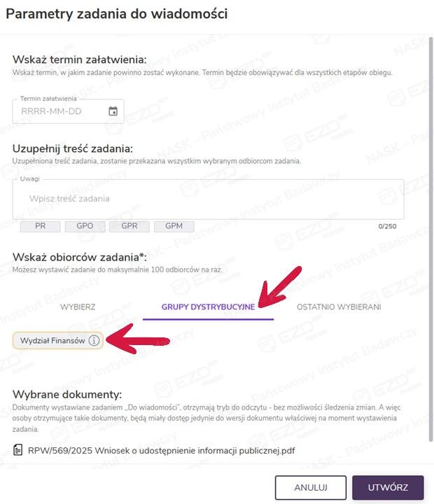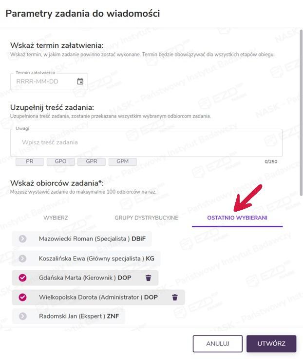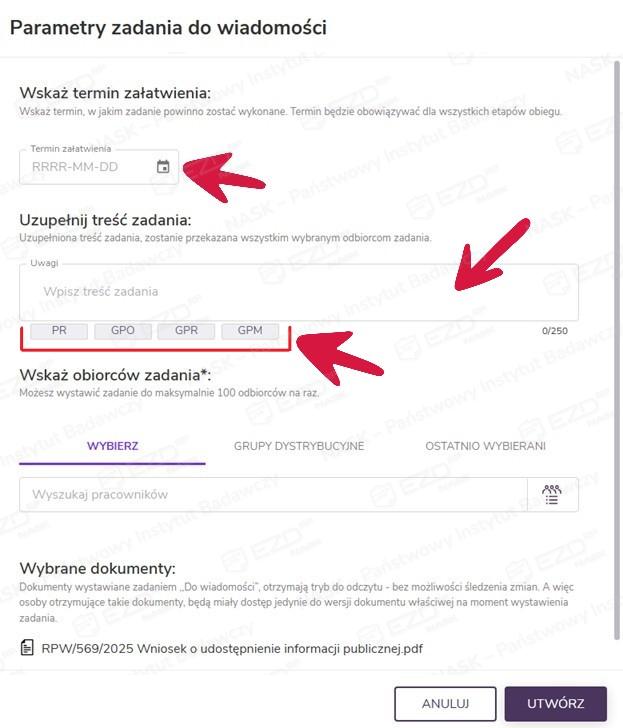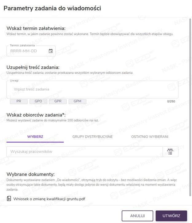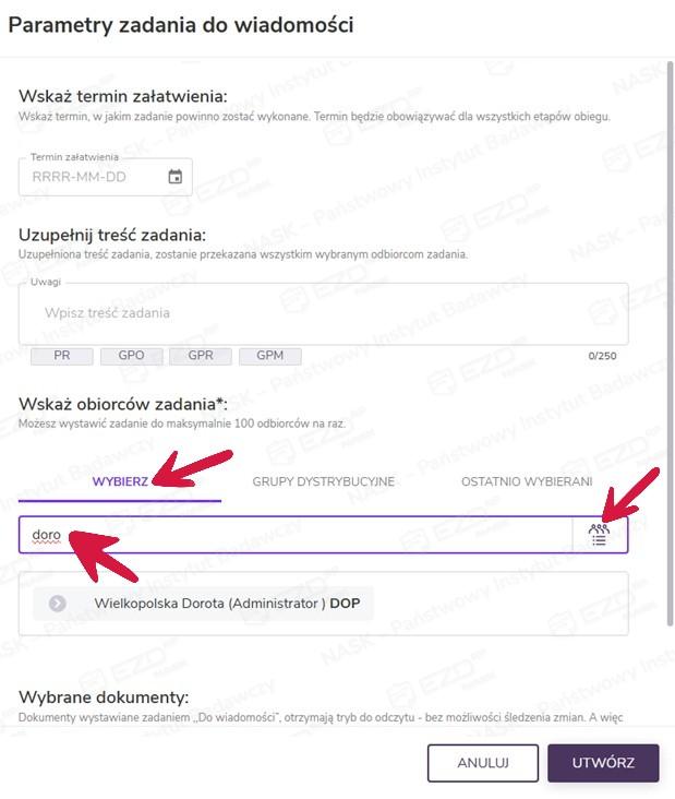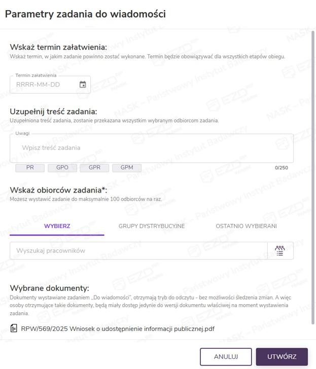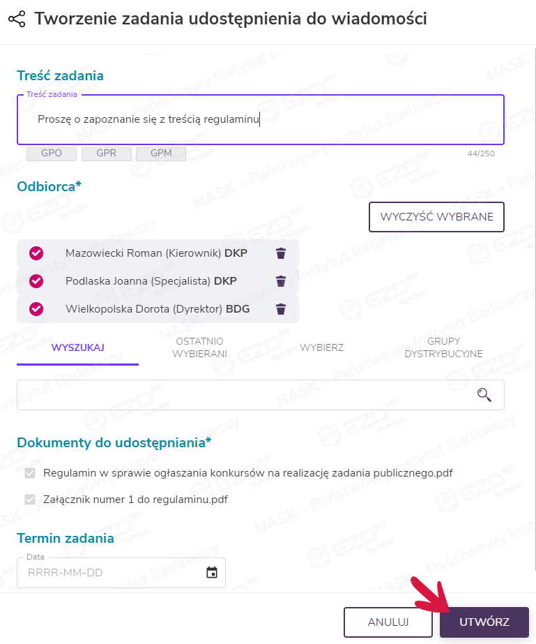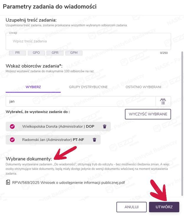 Po wskazaniu odbiorców można jeszcze zweryfikować wybór dokumentów, które zostaną przekazane w zadaniu Do wiadomości. Zadanie zostanie wystawione po kliknięciu przycisku Utwórz.
