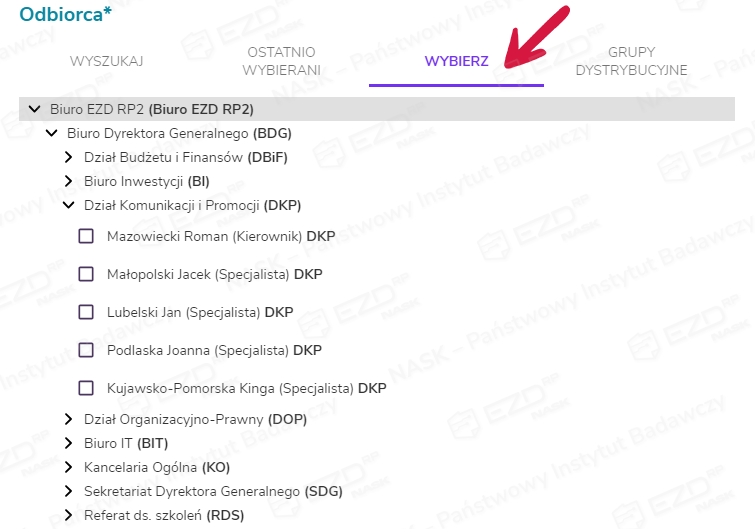 Możliwe jest również wyszukanie ich w strukturze organizacyjnej podmiotu dostępnej w zakładce Wybierz.