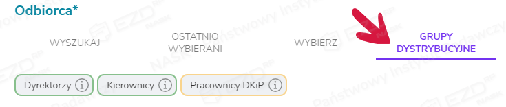 System daje również możliwość użycia zdefiniowanych wcześniej grup pracowników. Opcja ta jest dostępna w zakładce Grupy dystrybucyjne. Wybór konkretnej grupy spowoduje wystawienie zadania wszystkim osobom, które są w niej uwzględnione. Więcej informacji na temat tej funkcji znaleźć można w artykule: Tworzenie i edycja grup dystrybucyjnych.