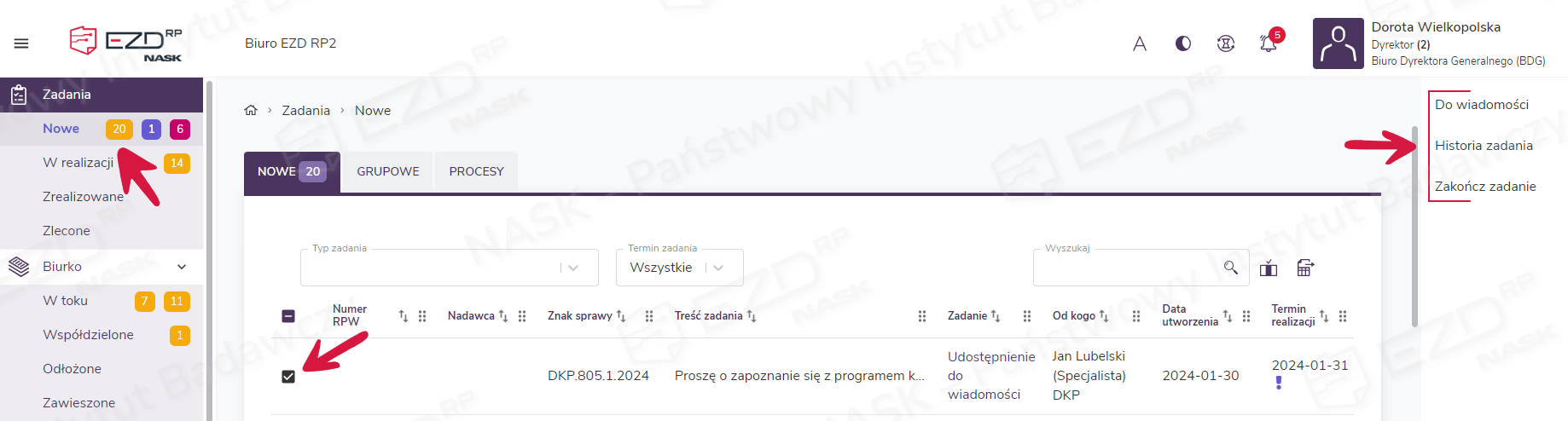 Udostępnione dokumenty pojawią się na kontach wskazanych podczas tworzenia zadania użytkowników w sekcji Zadania > Nowe. Z tego miejsca każdy z nich może stworzyć zadanie udostępnienia do wiadomości dla kolejnych osób, zobaczyć historię zadania lub je zakończyć. Opcje te są dostępne w prawym menu, które pojawia się po zaznaczeniu pola wyboru przy konkretnym zadaniu.