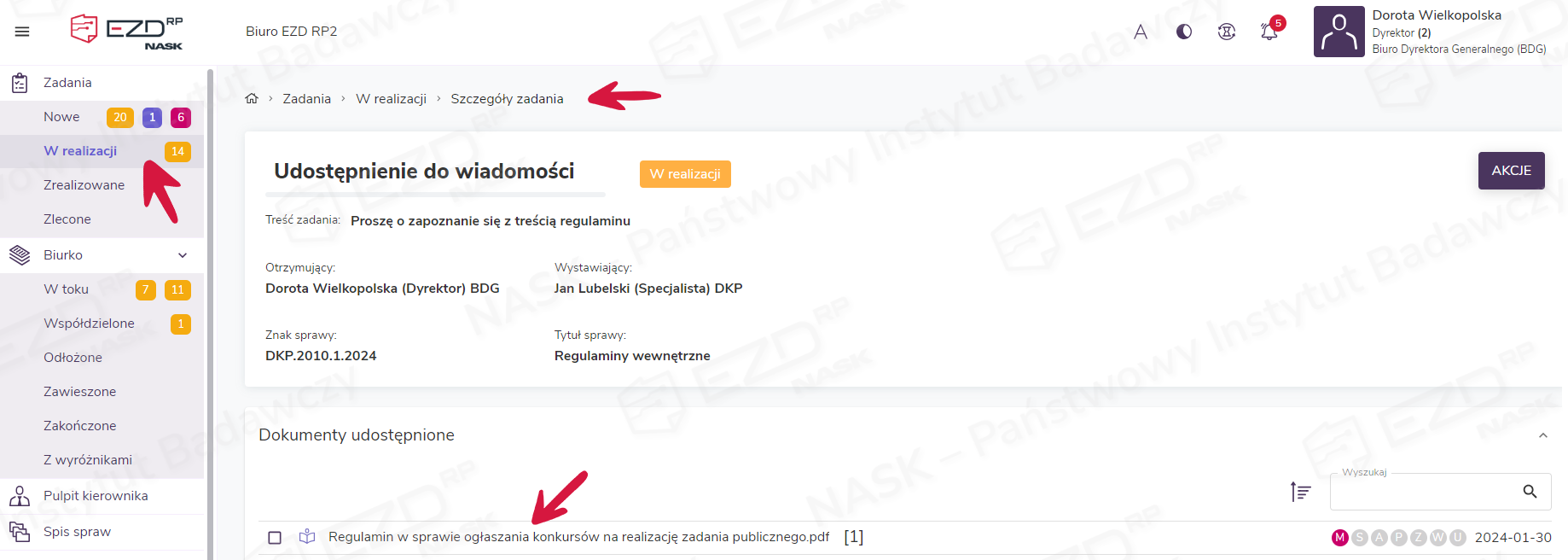 System EZD RP daje możliwość tworzenia zadań Do wiadomości. Z takiego zadania można skorzystać, gdy istnieje potrzeba przekazania innym pracownikom dokumentów w celu zapoznania się z ich treścią. Dokumenty przekazane w zadaniu Do wiadomości są dostępne tylko w trybie do odczytu, zatem otrzymujący takie zadanie nie mają możliwości wykonania edycji dokumentu ani jego metadanych.